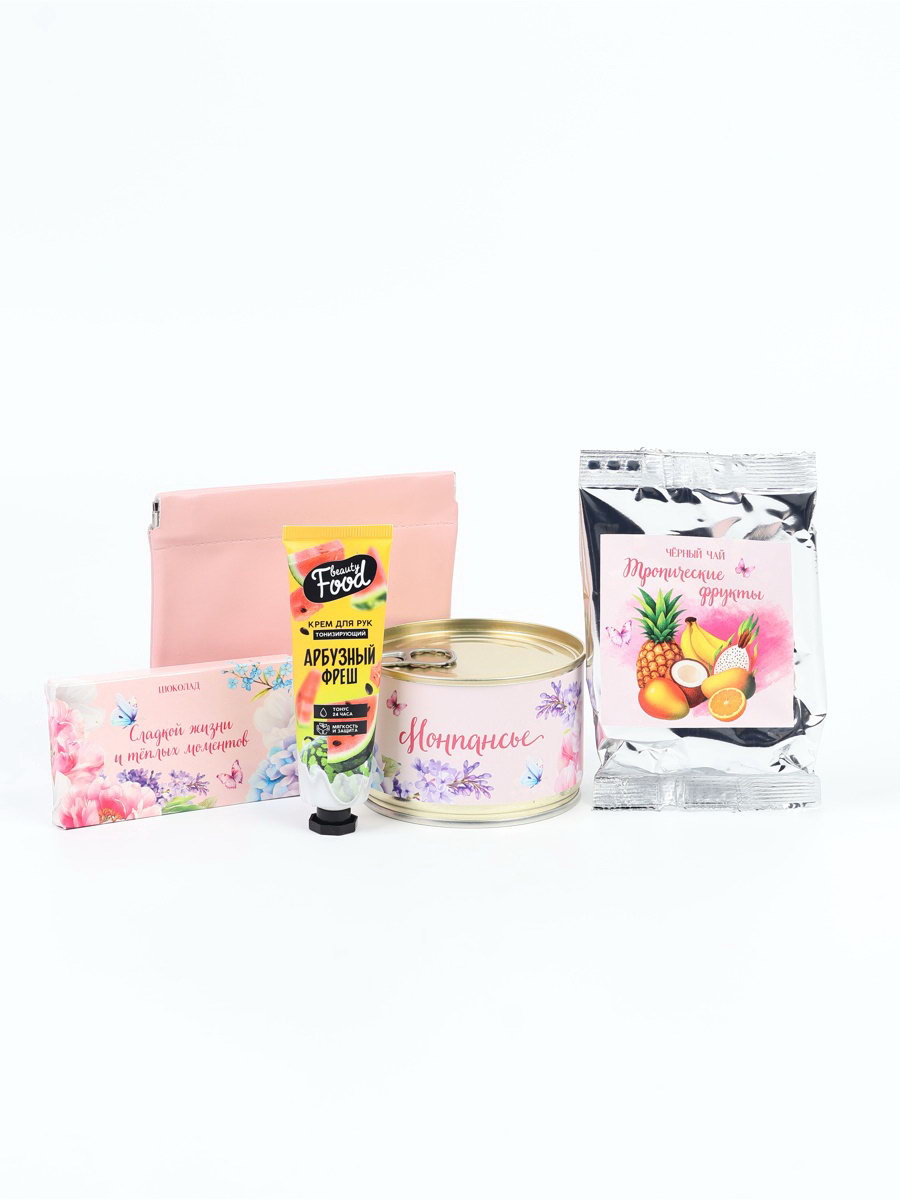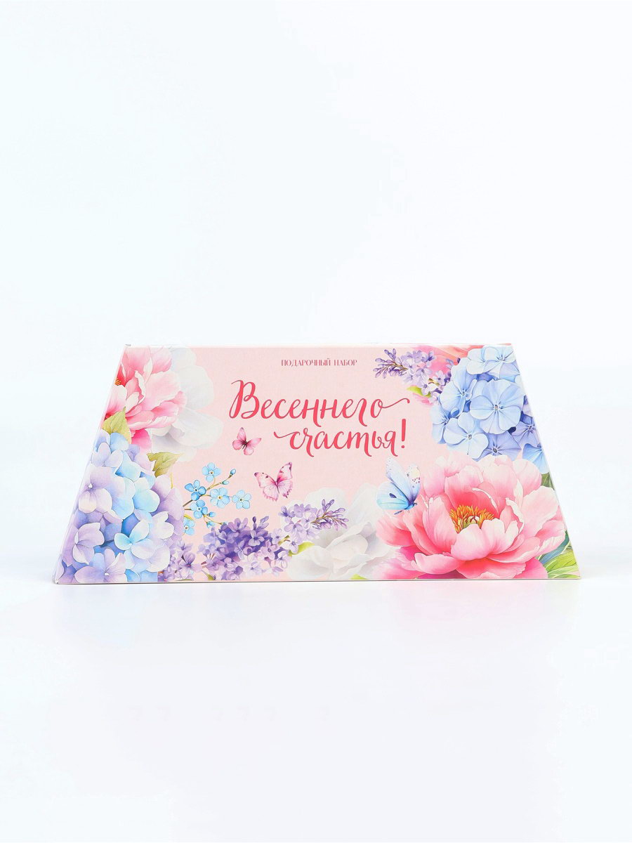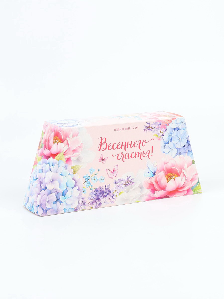 Подарочный набор гифтбокс "Весеннего счастья": шоколад, монпансье, крем для рук, чай, косметичка, Фабрика счастья, Россия