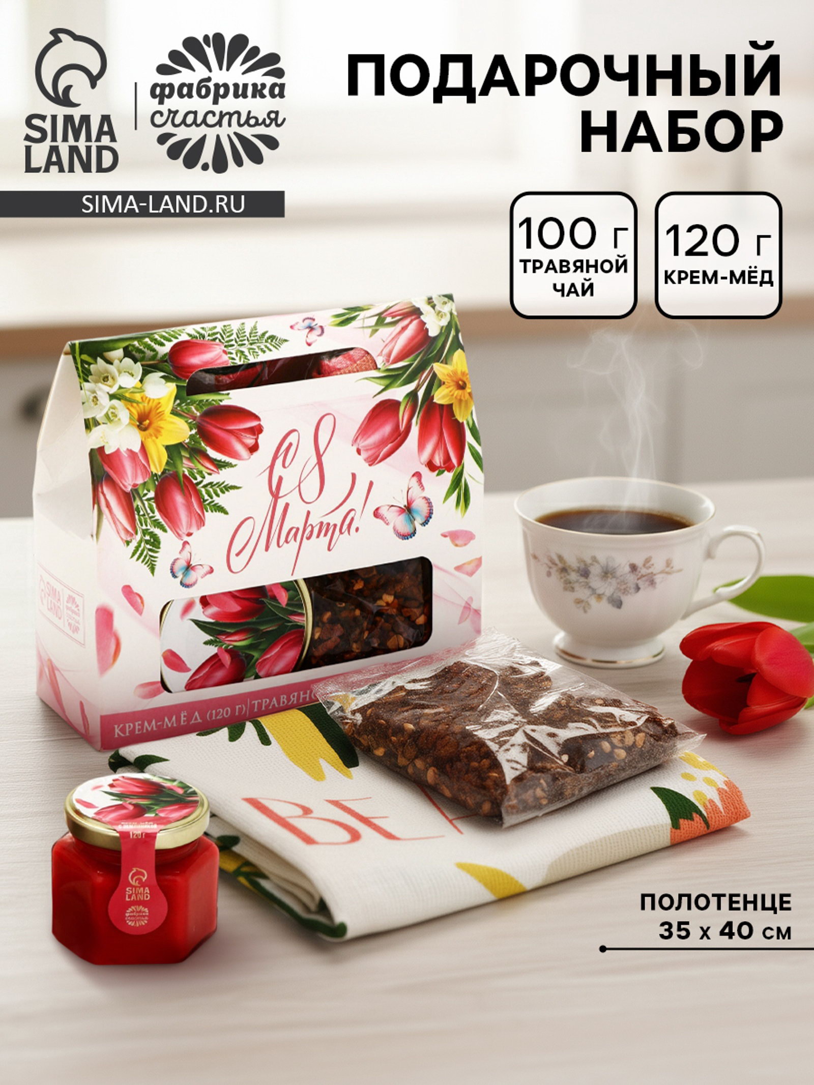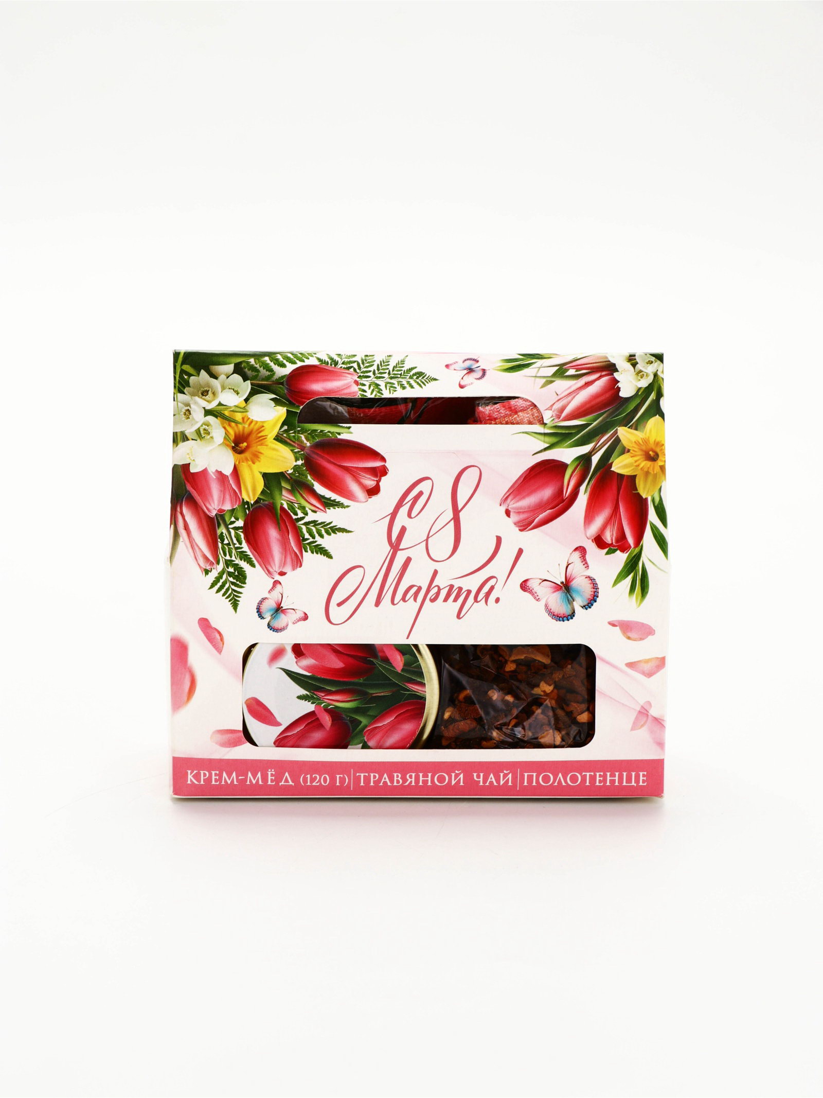 Подарочный набор "С 8 марта": крем-мёд 120 г, травяной чай, полотенце, Фабрика счастья, Россия