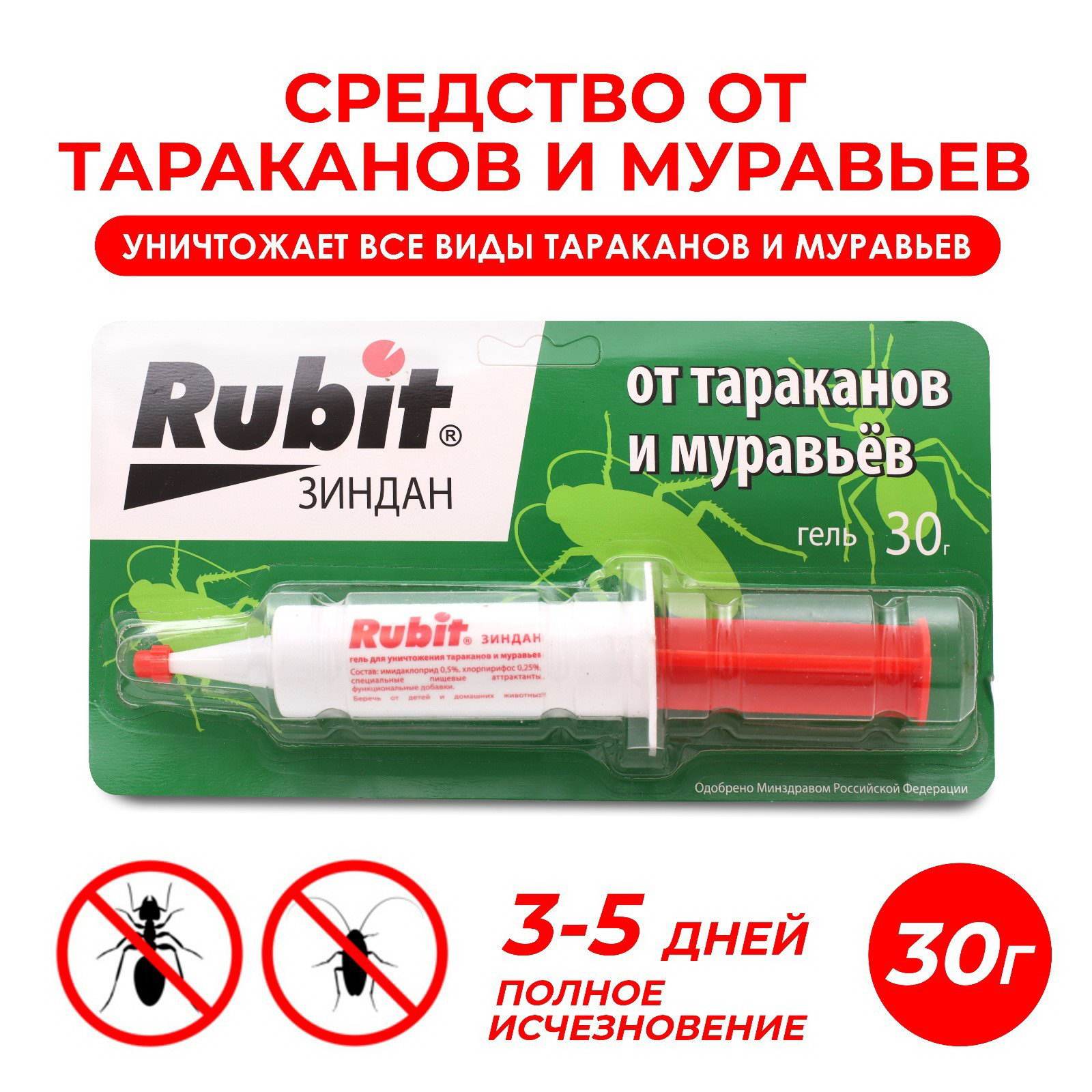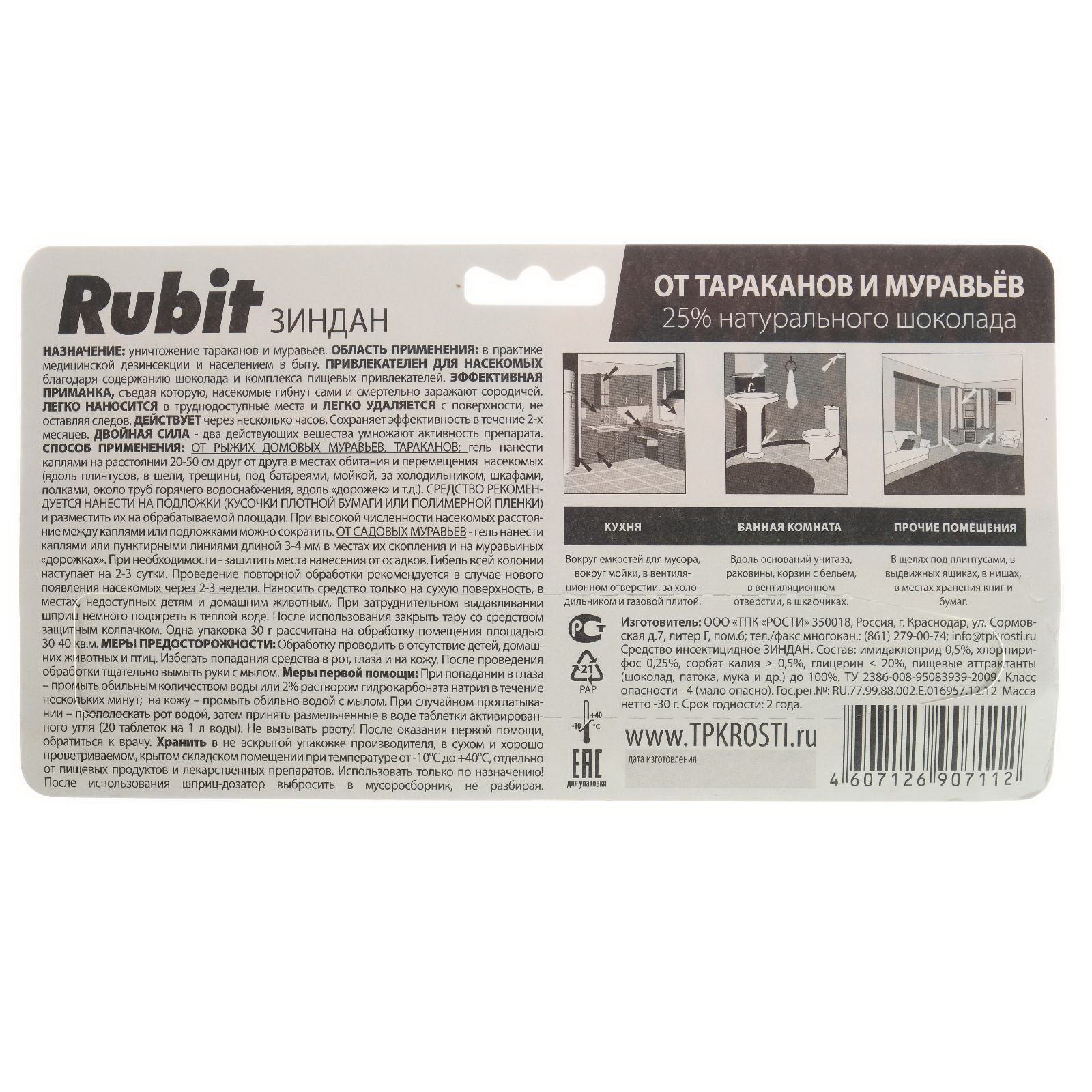 Средство от тараканов и муравьев ЗИНДАН гель люкс 30 г, Rubit, Россия
