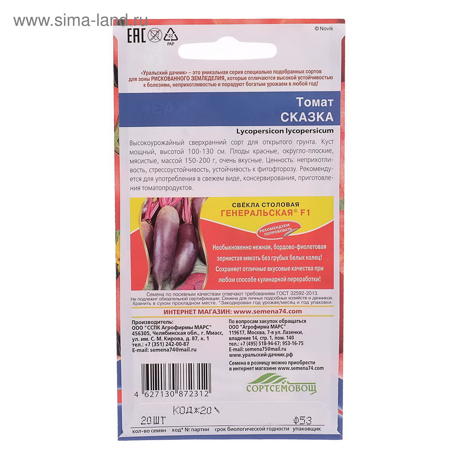 Семена Томат "Сказка", 20 шт, Уральский Дачник, Россия