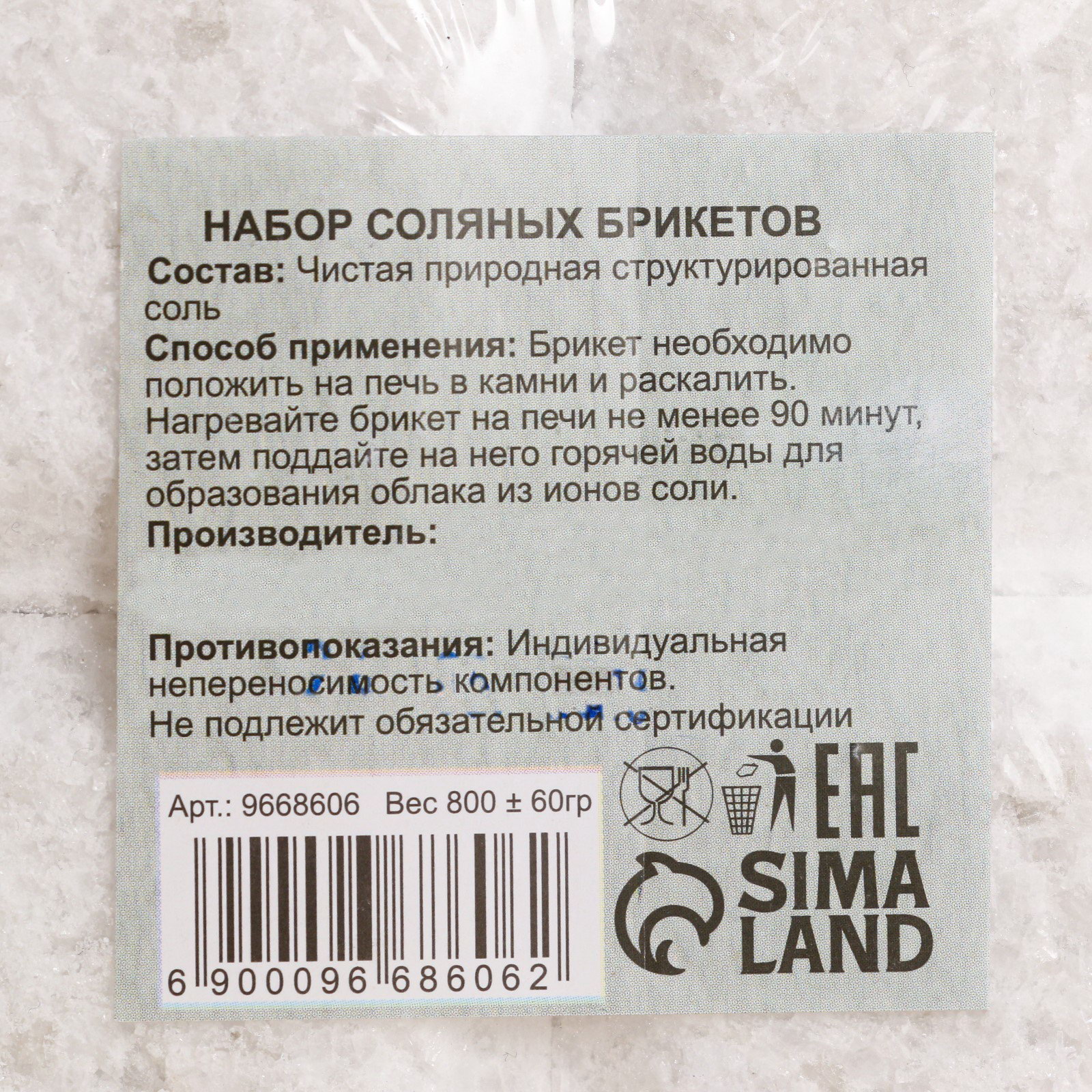 Размер упаковки: 10.2 x 4.6 x 10.2 см. Вес, г: 800 Вес, г: 800 tnved: 3307300000 Температурное ограничение: Нет Вид: Природная структурированная соль Ароматизированная: Нет Аромат: Соль Соляной брикет набор 4 шт. по 200 г это природная польза гималайской соли в удобном формате для вашей бани или сауны. Каждый брикет аккуратно спрессован, чтобы долго сохранять форму и равномерно выделять полезные минералы при нагревании. Соль насыщает воздух отрицательно заряженными ионами, способствует лёгкому дыханию, укреплению иммунитета и общему расслаблению организма. Компактный размер позволяет легко разместить брикеты между камнями в печи или на жаропрочной поверхности. Их можно использовать по одному или комбинировать, создавая собственную атмосферу парной. Способ применения: Поместите брикет среди камней или на металлическую подставку в парной. Прогрейте в течение 60–90 минут, чтобы соль накопила тепло. Для активации полезных свойств слегка сбрызните брикет горячей водой. Используйте каждый брикет несколько сеансов, пока он полностью не растворится | ||