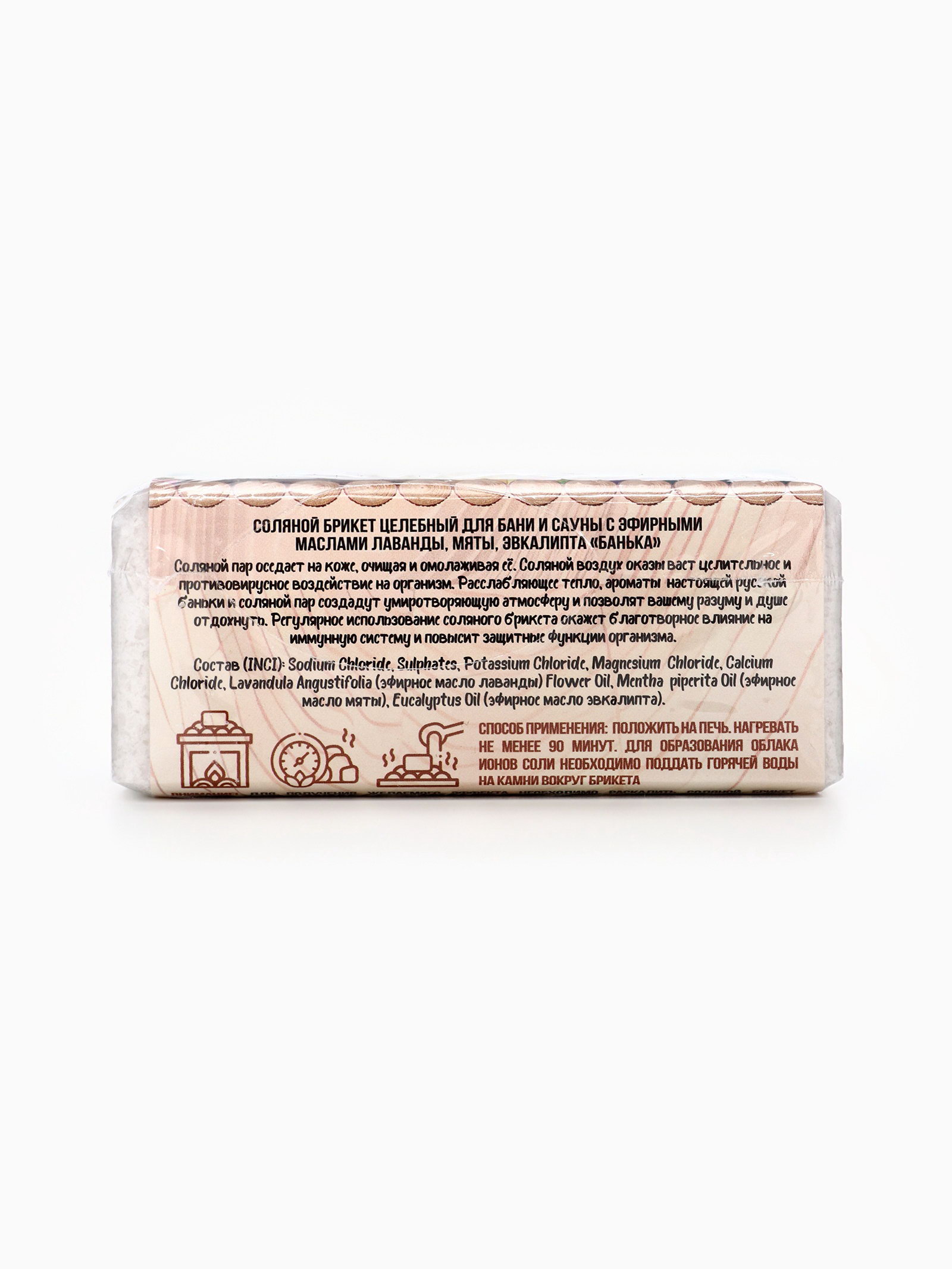 Размер упаковки: 7.5 x 4.5 x 10.5 см. Вес, г: 500 Температурное ограничение: Нет Вид: Морская Аромат: Нейтральный Ароматизированная: Нет tnved: 3307300000 tnved: 3307300000 Для получения оздоровительного эффекта рекомендуется поливать горячей водой камни вокруг брикета. Такой способ использования дает возможность создавать легкое мелкодисперсное паровое облако из солевых ионов и микроэлементов, обогащенное эфирными маслами, которое благотворно влияет на организм человека даже при ослаблении аромата летучие вещества эфирных масел, в силу их высокой проникающей способности, мягко и бережно воздействуют на органы дыхания, иммунную и нервную системы. Состав: Sodium Chloride, Sulphates, Potassium Chloride, Magnesium Chloride, Calcium Chloride, Lavandula Angustifolia (эфирное масло лаванды) Flower Oil, Mentha piperita Oil (эфирное масло мяты), Eucalyptus Oil (эфирное масло эвкалипта). | ||