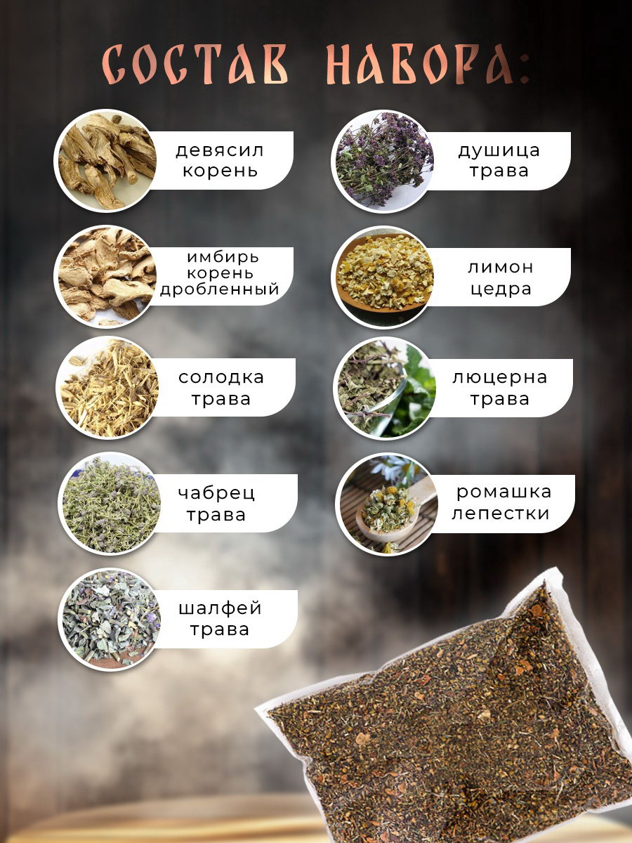 Противопоказания: не рекомендуется: при сосудистых заболеваниях, повышенном артериальном давлении, аллергических заболеваниях, непереносимости лекарственных трав и камфоры, во время беременности, а также, сразу после приема алкоголя и еды. Состав: девясил корень, душица трава, имбирь корень дробленный, лимон цедра, люцерна трава, ромашка лепестки, солодка трава, чабрец трава, шалфей трава. | ||
