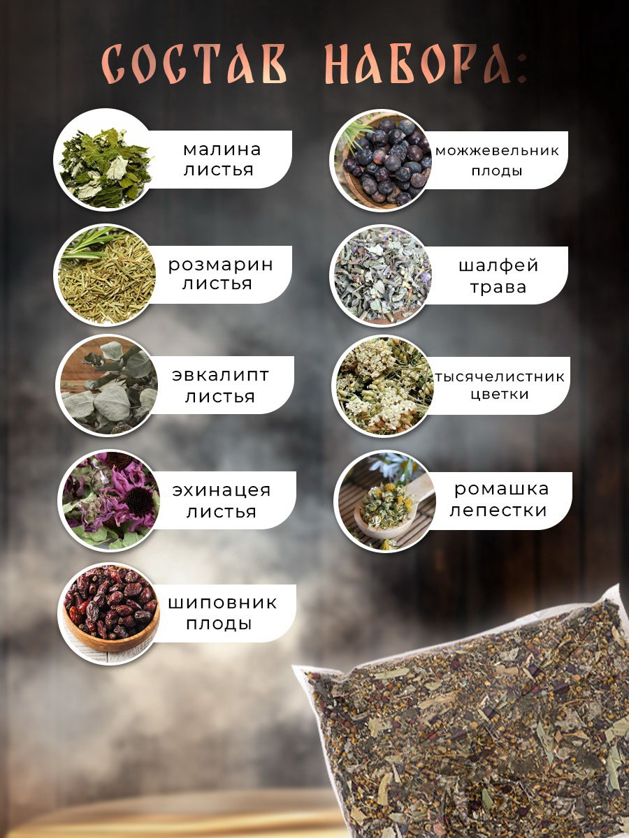 Противопоказания: не рекомендуется: при сосудистых заболеваниях, повышенном артериальном давлении, аллергических заболеваниях, непереносимости лекарственных трав и камфоры, во время беременности, а также, сразу после приема алкоголя и еды. Состав: малина листья, можжевельник плоды, розмарин листья, ромашка лепестки, тысячелистник трава, шалфей трава. шиповник плоды, эвкалипт листья, эхинацея листья. | ||