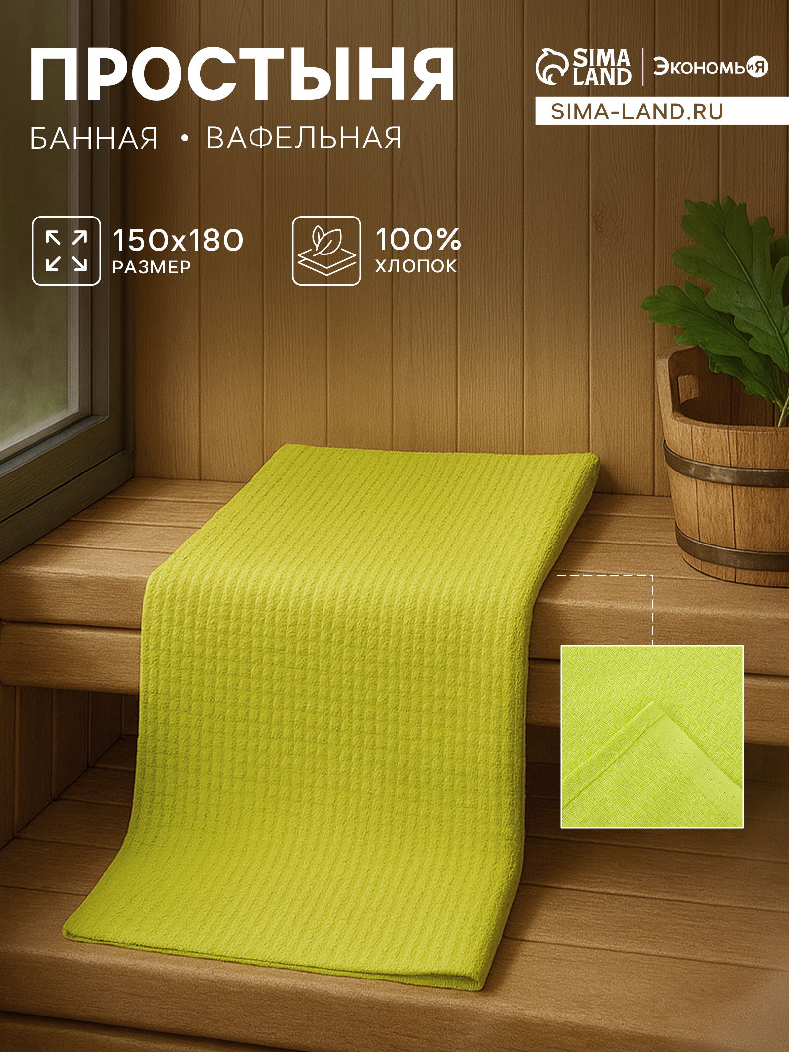 Простыня вафельная для бани 150х180 см, цвет салатовый 100% хлопок, 200 гр/м2, 145x180 см., Экономь и Я, Россия
