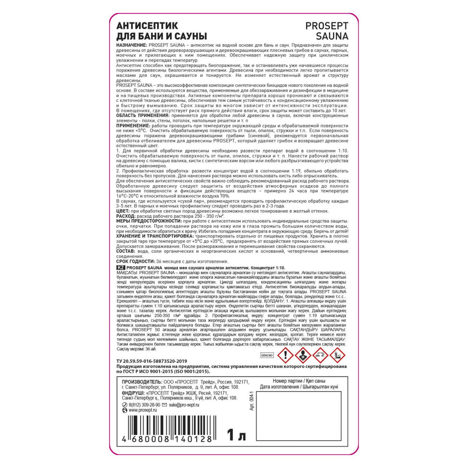 Антисептик для бани и сауны Sauna, концентрат, 1л, PROSEPT, Россия