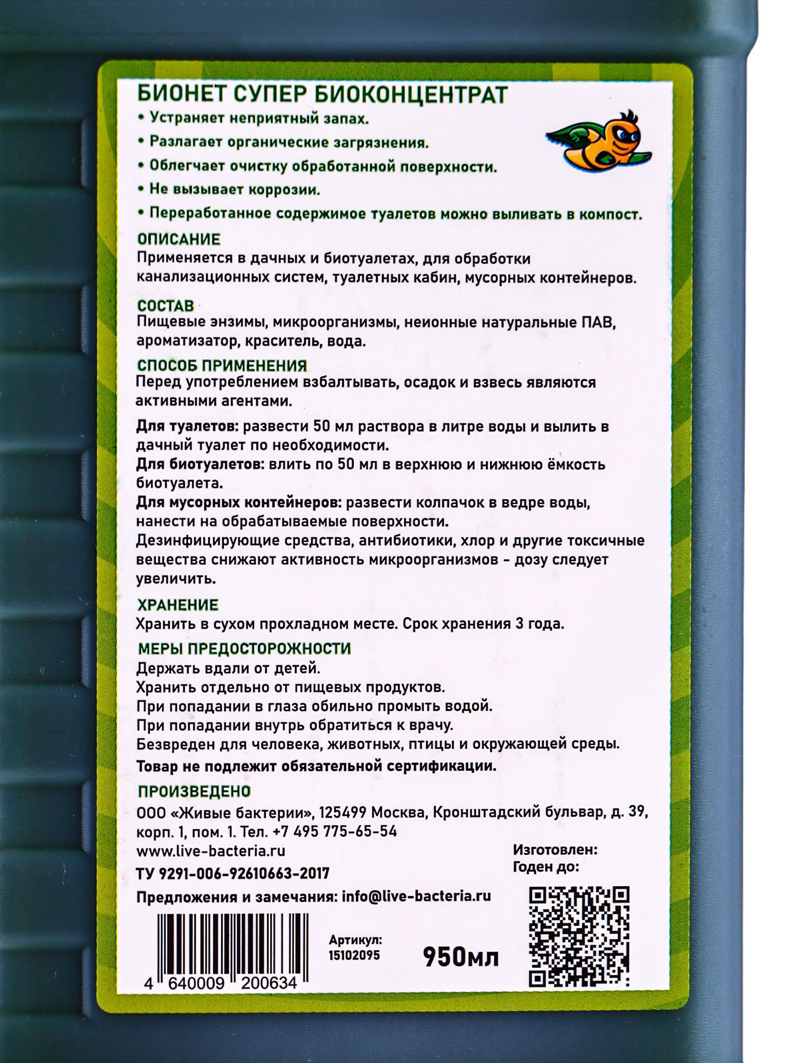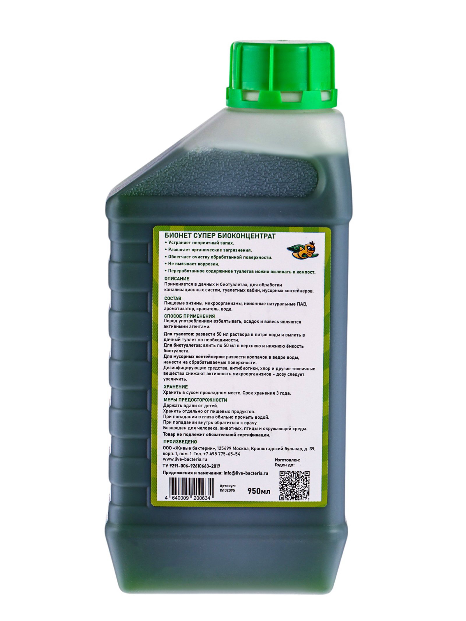 Средство для всех видов туалетов, мусорных баков Биоконцентрат Бионет Супер, 950 мл, Живые Бактерии, Россия