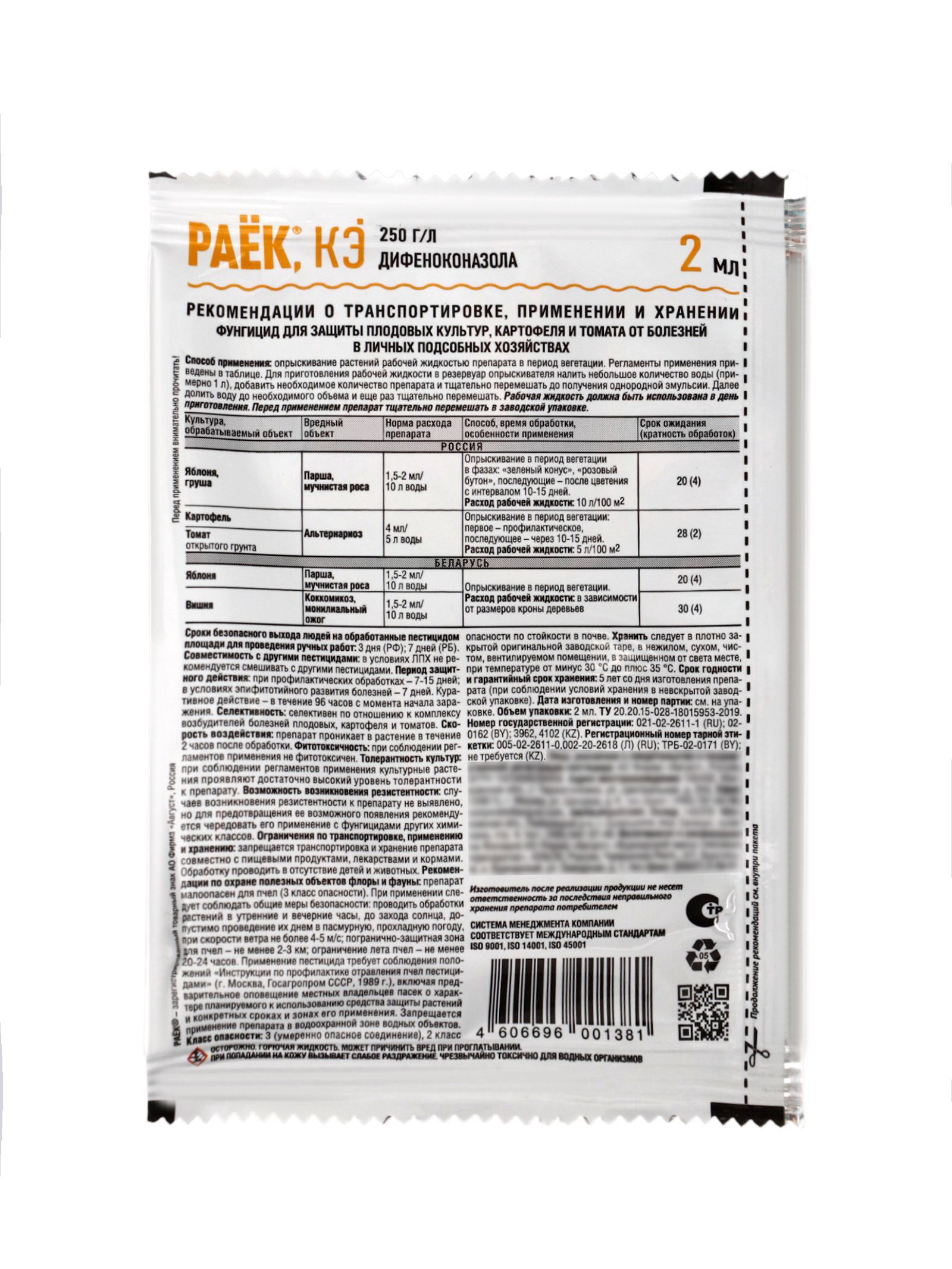 Действующее вещество: 250 г/л дифеноконазола. Препаративная форма: концентрат эмульсии. Способ применения: для приготовления рабочей жидкости расчётную дозировку препарата растворить в небольшом объёме воды и довести объем рабочего раствора до 10 л Рабочую жидкость следует готовить непосредственно перед опрыскиванием и использовать полностью в тот же день. . Срок годности: 3 года. | ||
