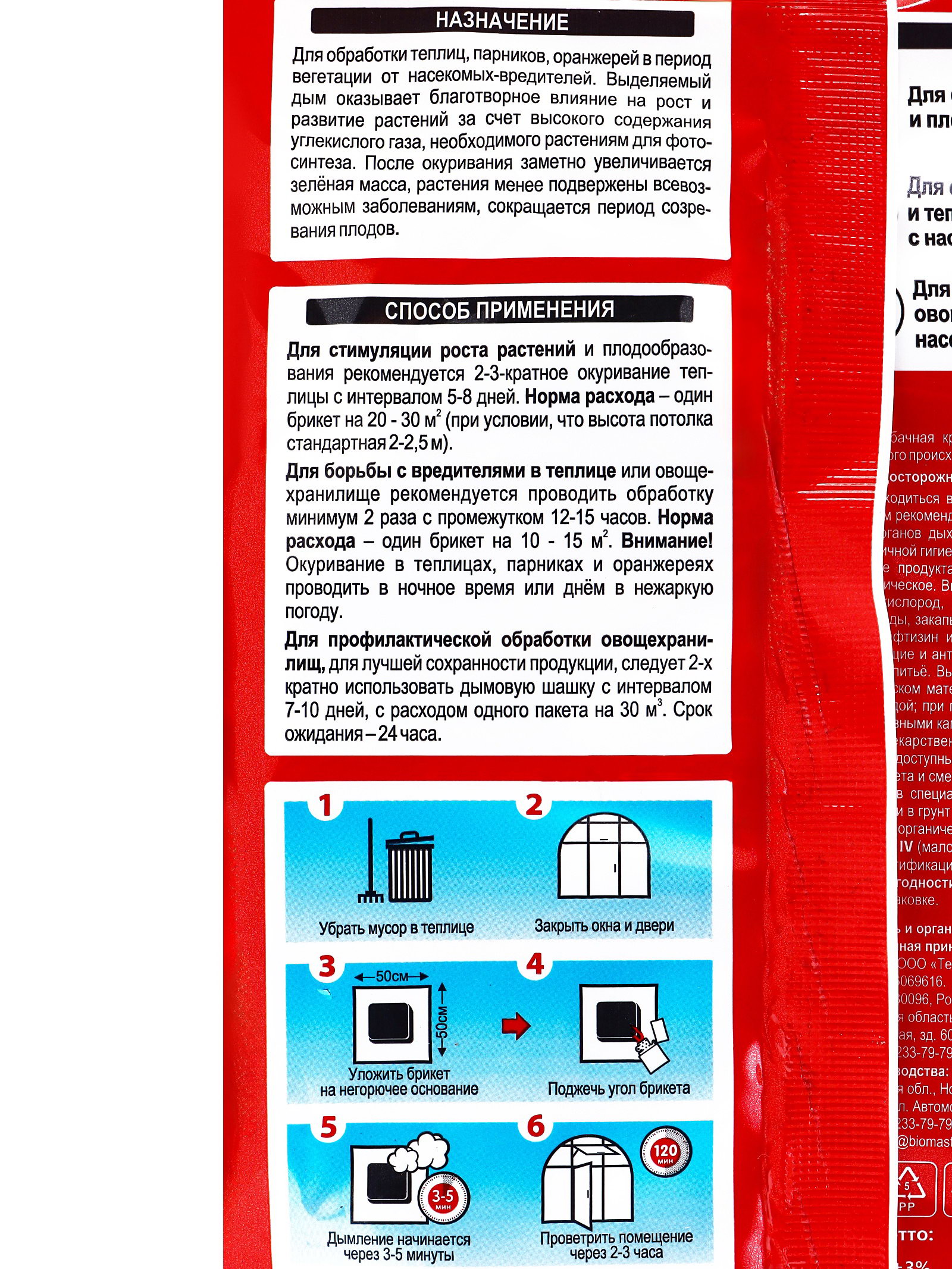Размер упаковки: 14 x 3 x 18 см. Вид: БИОпрепараты Вид: БИОпрепараты tnved: 3808918000 Вес/Объём: 250 г Препаративная форма: Палочки Действующие вещества: Табак Тип пестицида: Контактный Способ нанесения: Распыление Сатурн: Да Температурное ограничение: Нет Область применения: От всех насекомых Алкалоид никотин, который в больших количествах содержится в листьях и стеблях табака, является ядом для множества насекомых, работая в составе растений в качестве их естественного защитника от вредителей. И огородники знают это с давних пор. для обработки овощехранилищ, погребов, хозяйственных помещений, сотовых хранилищ, теплиц. Самым эффективным средством обработки помещений от всевозможных паразитов, является окуривание. Обрабатываются с целью дезинфекции и борьбы с бактериальными инфекциями, плесенью, грибками, насекомыми-вредителями и грызунами. Дым, состоящий из паров никотина, сернистого ангидрида и угарного газа, проникает в самые труднодоступные места, не оставляя паразитам никаких шансов. Гарантированно уничтожает блох, клещей, вшей, мух, плодовую моль, а также грибков и других опасных микроорганизмов. | ||