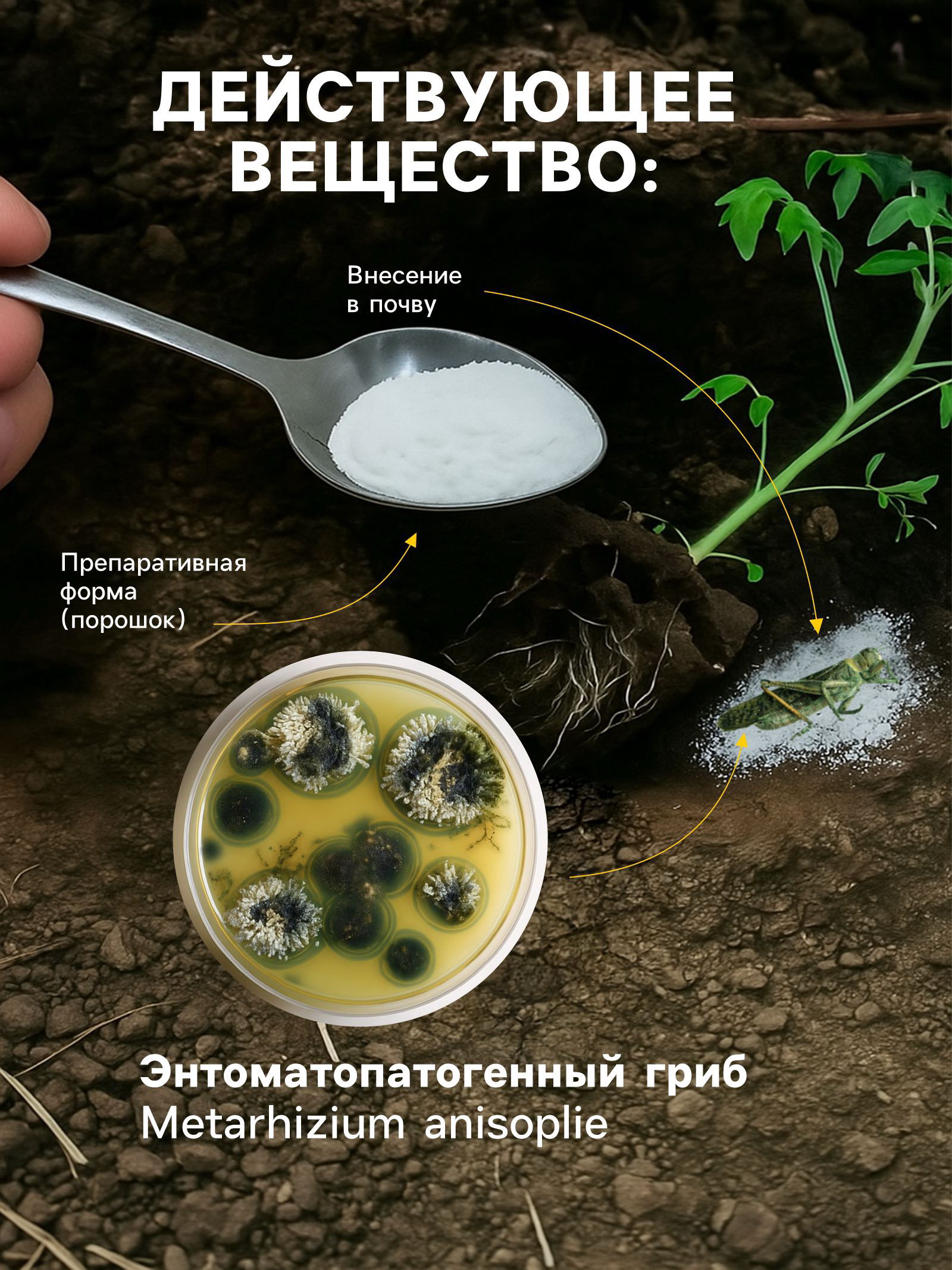 Способ нанесения: Опрыскивание, Полив Область применения: От всех насекомых, От садовых вредителей Размер упаковки: 14 x 2 x 20 см. Вид: БИОпрепараты Вес/Объём: 250 г Вид средства: Инсектицид Препаративная форма: Порошок Действующие вещества: Гриб (Metarhizium anisopliae) Тип пестицида: Контактный tnved: 3808929000 Температурное ограничение: Нет Метаризин - биологический препарат на основе высокоэффективного штамма гриба Metarhizim для защиты культурных растений от опасных насекомых вредителей обитающих в почве. Эффективен против зимующих форм насекомых вредителей: проволочник, майского жука, подгрызающей совки, медведки, мухи (белой, луковой, морковной, свекловичной минирующей), галлицы (смородиновой, яблонной), точило лукового, филлоксеры, малиновой моли, клещей (паутинного, земляничного), листовда (земляничного, крыжовникового) и личинок: майского и колорадского жука. Способ и нормы применения: 1. Внесение в почву сухого препарата во время высадки посевного материала (семян, клубней, рассады, саженцев или растений с заделкой в почву. Если растения высажены делается углубление в зоне корня, вносится препарат, присыпается землей. После внесения сухого препарата полить. Гриб проявляет большую эффективность во влажной почве! на 1 сотку участка. В сухом виде или в рабочем растворе, с последующей заделкой в почву. Норма внесения: 50-100 гр на 1 сотку/ 15-20 гр на кустарник, дерево. 2. Внесение в почву рабочего раствора, для приготовления рабочего раствора 50 гр препарата растворяют в 30-50 литрах поливной воды, тщательно размешать и внести в почву вместе с образующим осадком. Приготовленный раствор использовать в течение суток. 3. Санация почвы (весенняя и осенняя обработка): 100 150 гр препарата Совместим с биологическими препаратами, инсектицидами и удобрениями. Не желательно совмещение с фунгицидами. При соблюдения регламентов применения не фитотоксичен для растений и растения проявляют высокий уровень толерантности к препарату. Преимущества: - сроки выхода для проведения ручных работ не ограничены; -нет срока ожидания до сбора урожая; - высокая скорость воздействия: обезвреживание в течение 10-12ч, гибель через 2-4 •период защитного действия препарата в течение всего сезона; - не вызывает резистентности (привыкания) у вредителей; - применим для выращивания органических овощей ; - кроме инсектицидной активности препарат оказывает ростостимулирующее и иммунное действие. | ||