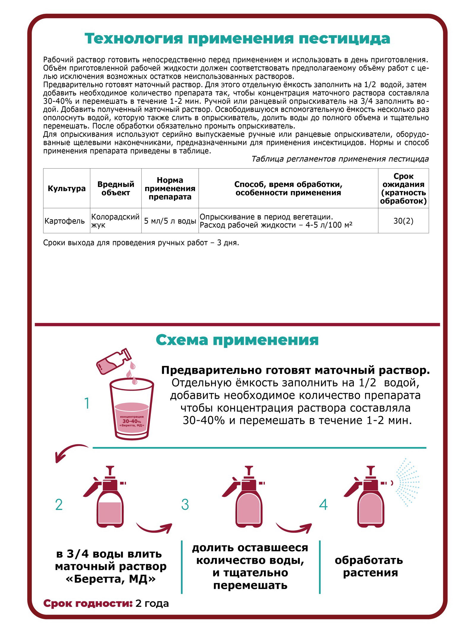 Способ применения Отмеренное количество препарата разводится в пластиковой или эмалированной ёмкости с небольшим количеством воды (1/4 от общего объёма) и полученная эмульсия тщательно размешивается (1-2 минуты). Затем рабочий состав доводится водой до требуемого объёма. Не допускается использование для приготовления рабочих растворов пестицидов посуды (ёмкостей) для пищевых продуктов и питьевой воды. Дополнительно