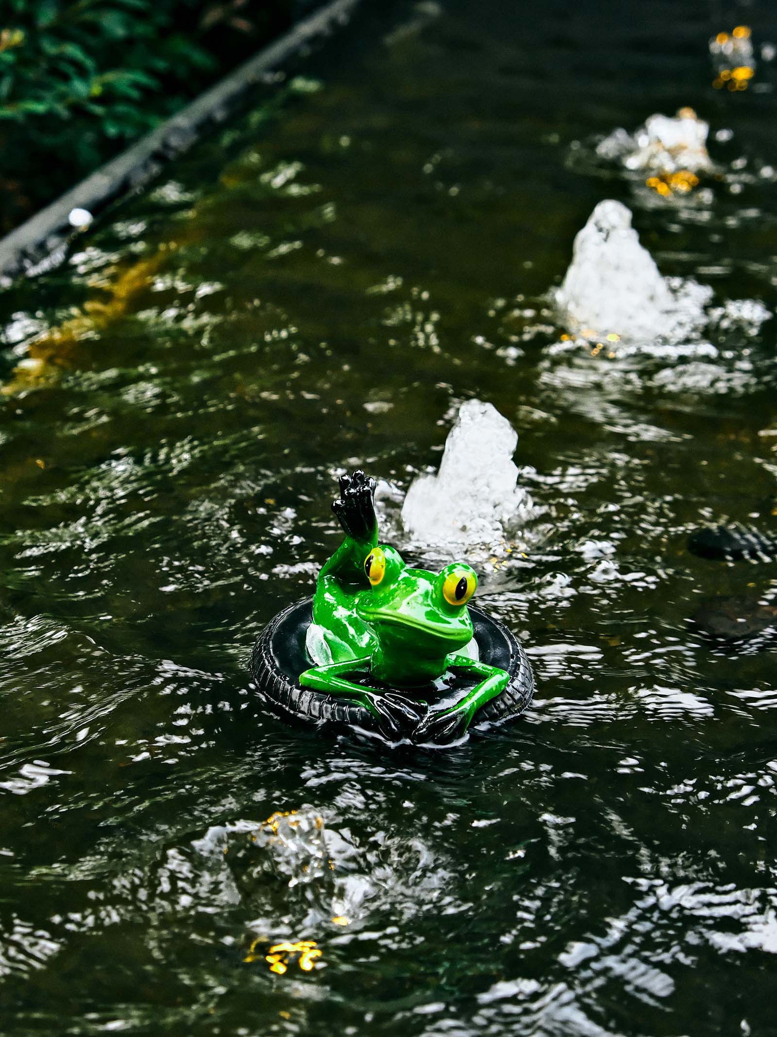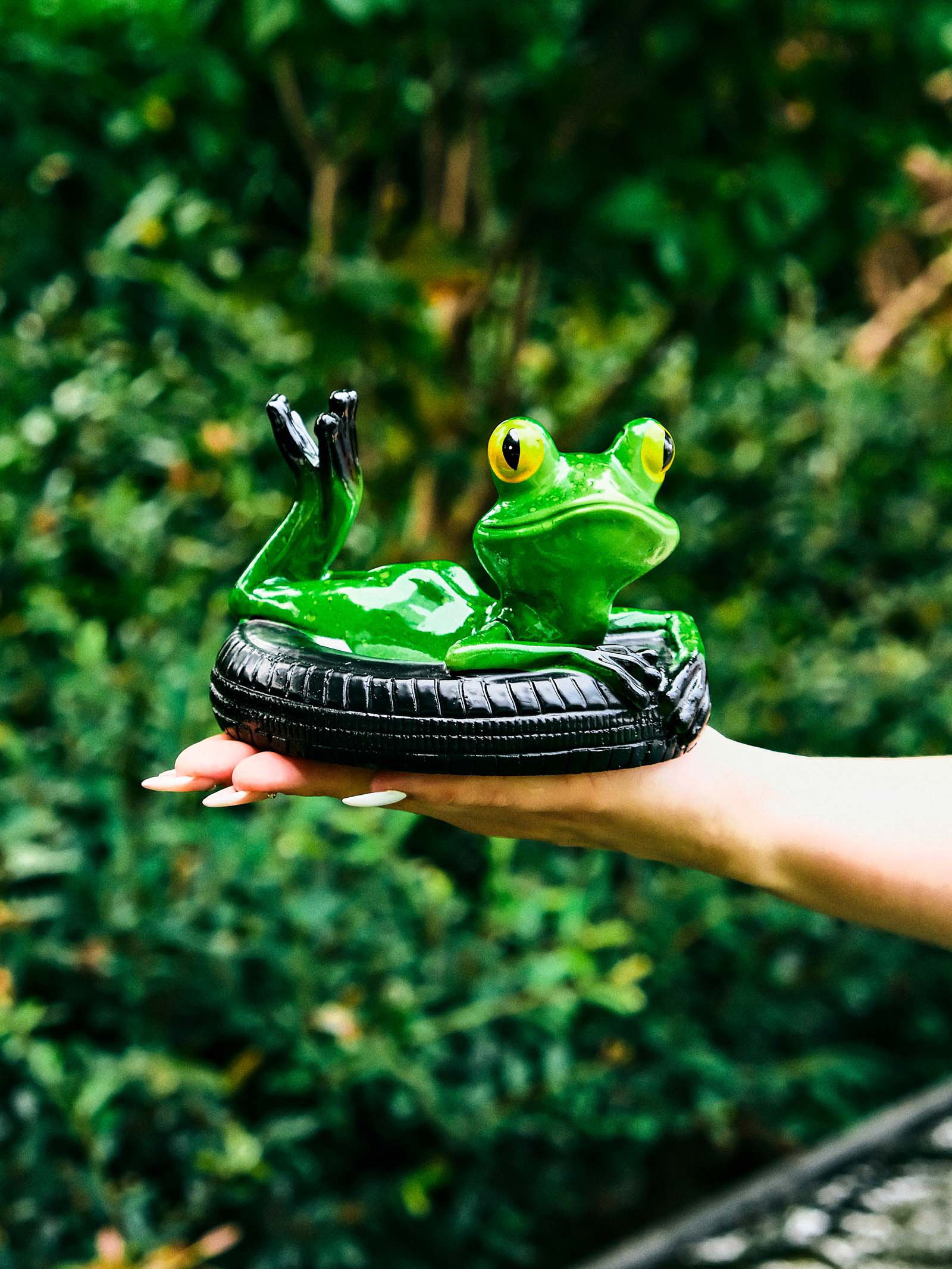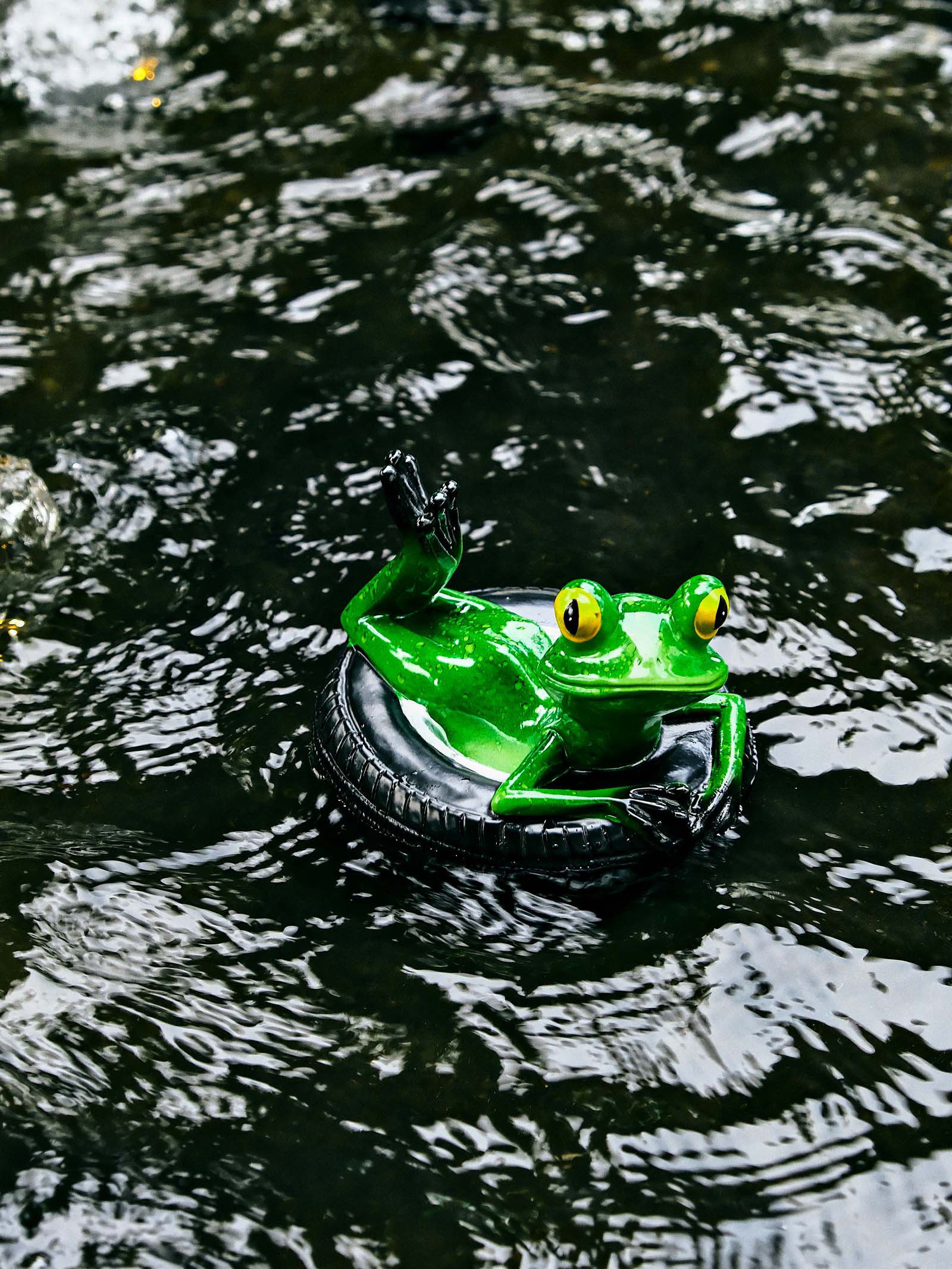 Садовая фигура из полистоуна "Лягушка на шине", 14x13x9.5 см, водоплавающая, 15.5x13x8.5 см., Китай