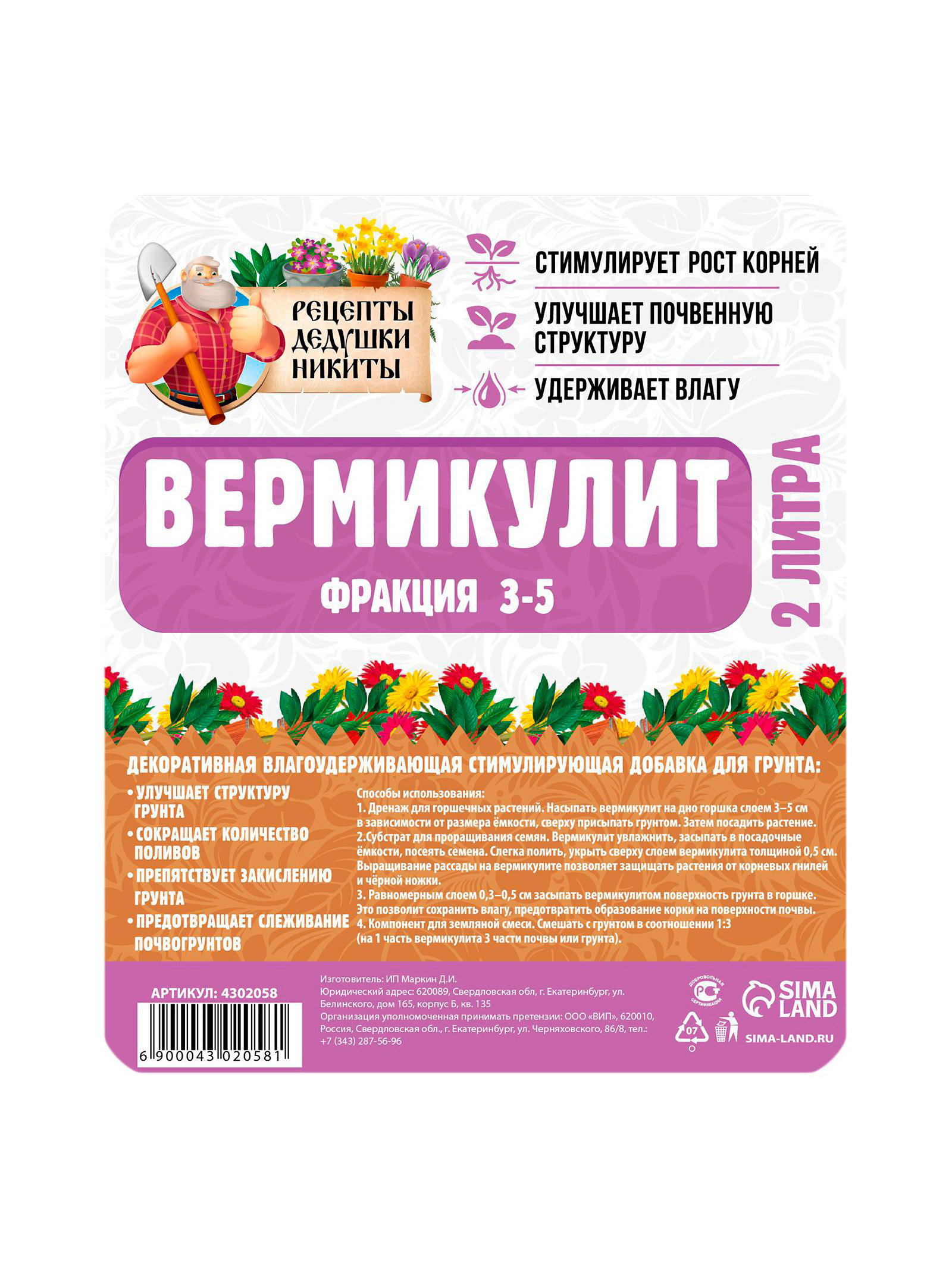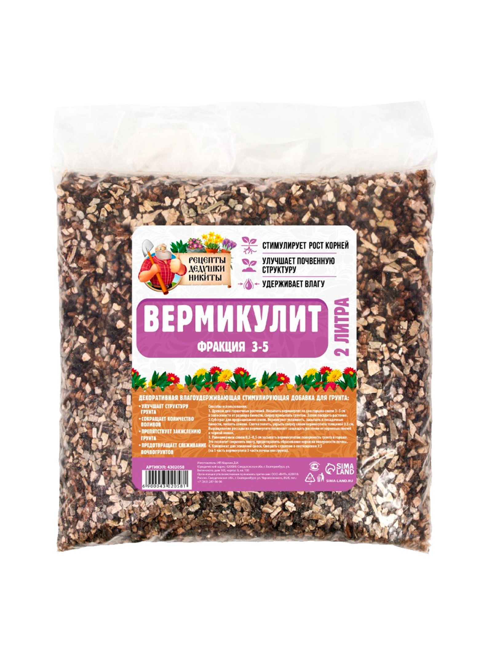 Вермикулит "Рецепты Дедушки Никиты" для растений, добавка в грунт, фр 3-5, 2 л, Рецепты дедушки Никиты, Россия