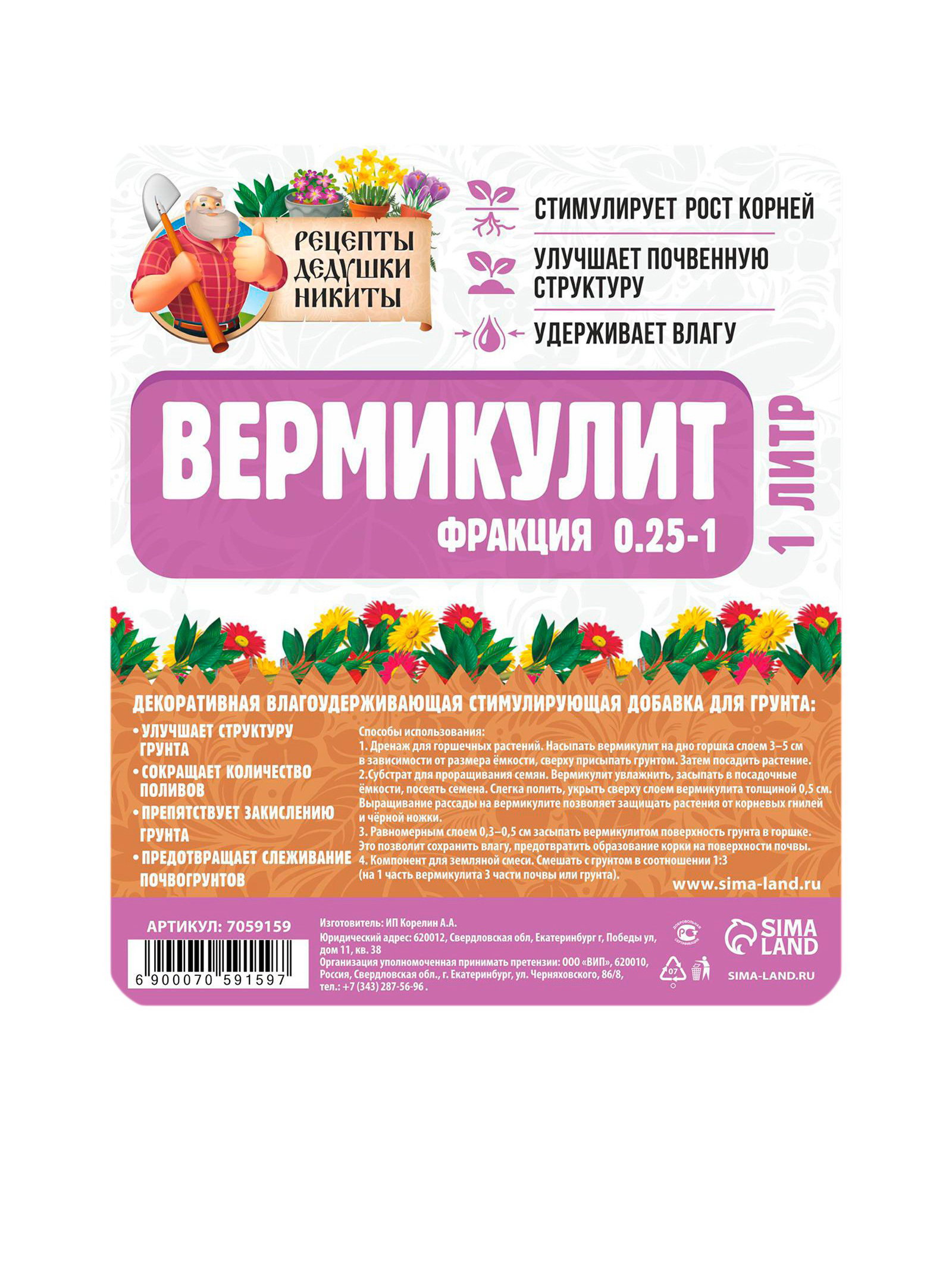 Вермикулит "Рецепты Дедушки Никиты" для растений, добавка в грунт, для рассады, фр 0.25-1, 1 л, Рецепты дедушки Никиты, Россия