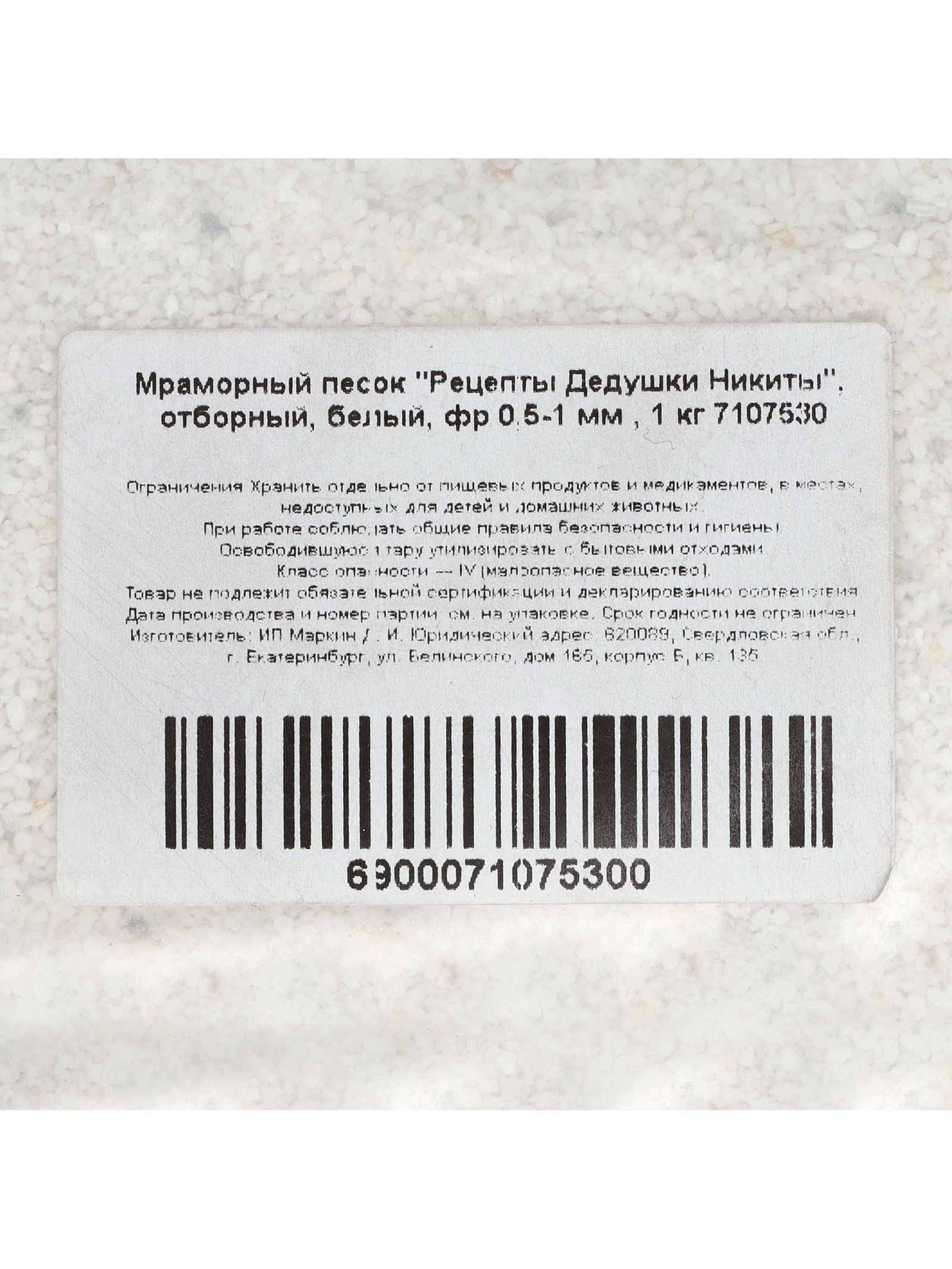 Мраморный песок "Рецепты Дедушки Никиты", отборный, белый, фр 0.5-1 мм, 1 кг, Рецепты дедушки Никиты, Россия