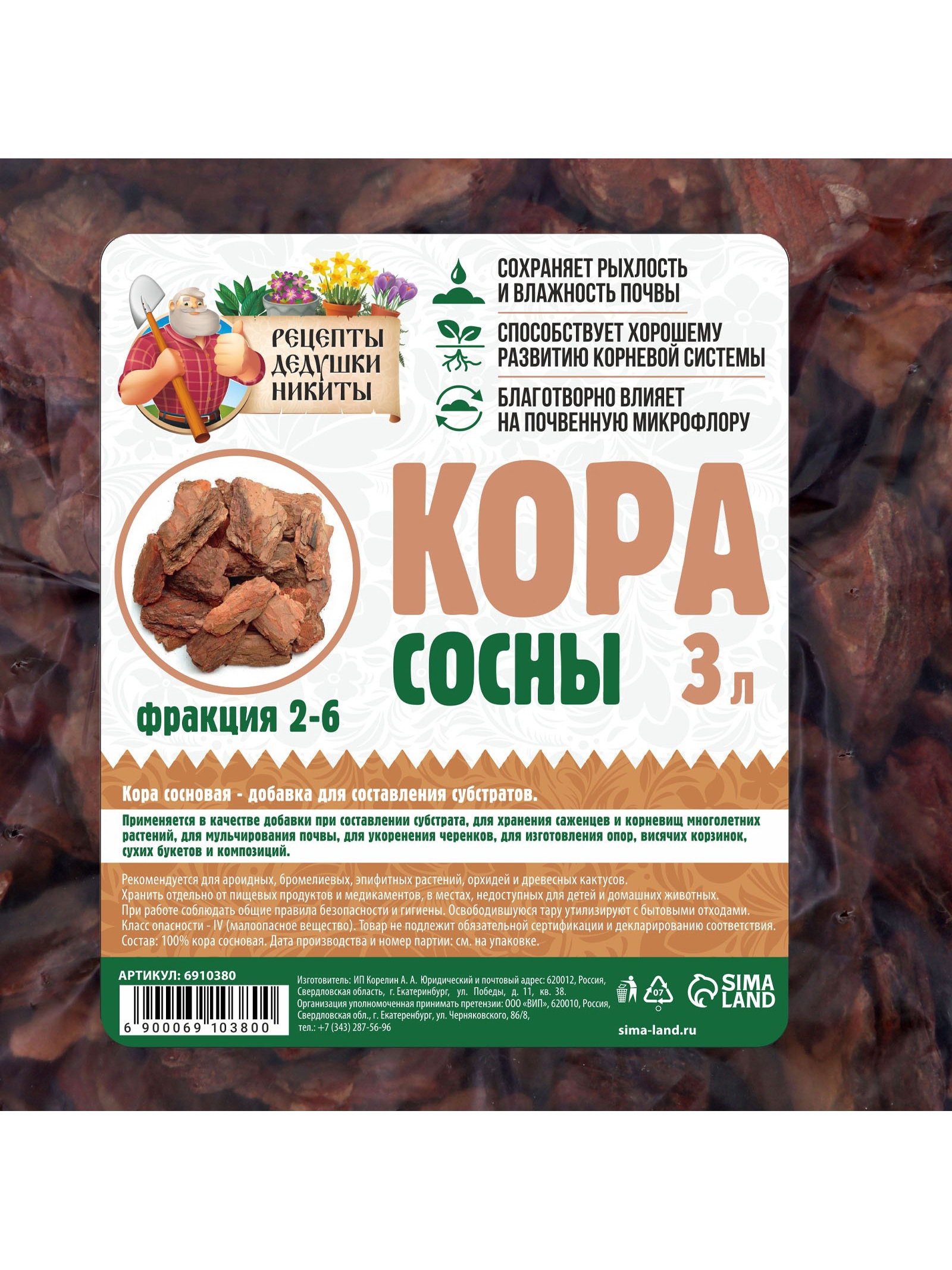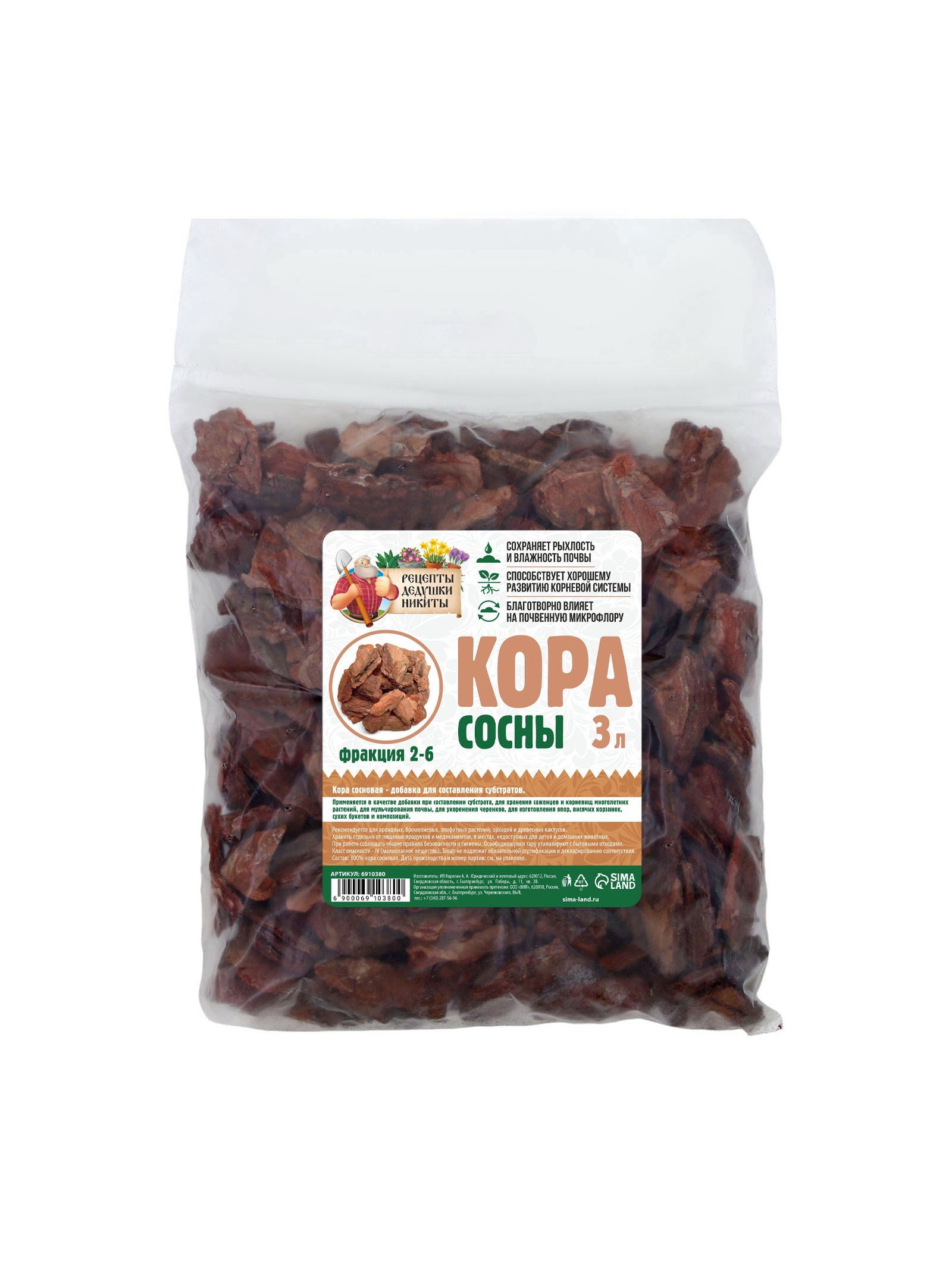 Кора сосны "Рецепты Дедушки Никиты", фр 2-6, 3 л, Рецепты дедушки Никиты, Россия