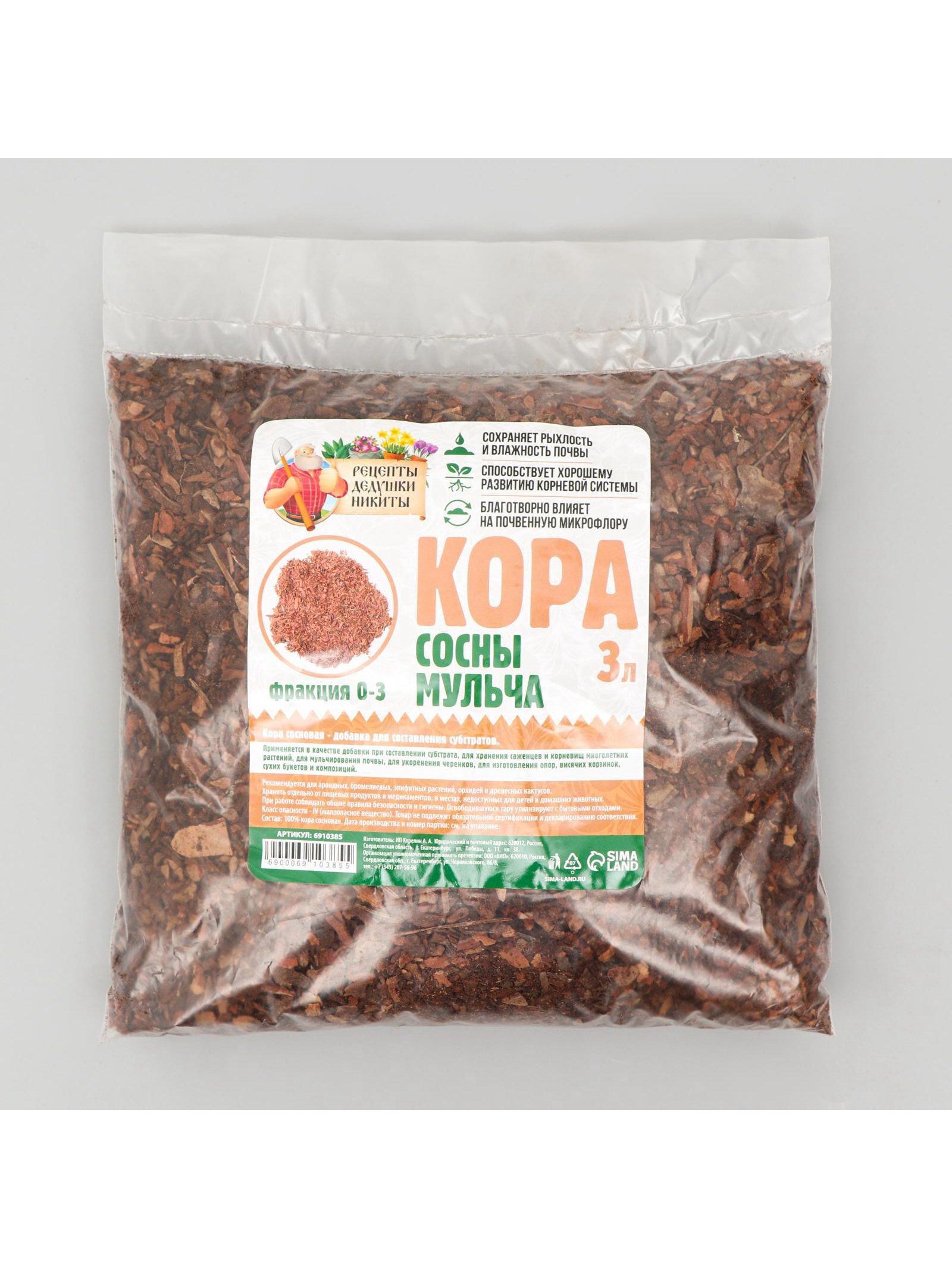 Мульча кора сосны "Рецепты Дедушки Никиты" 3 л фр 0-3, Рецепты дедушки Никиты, Россия