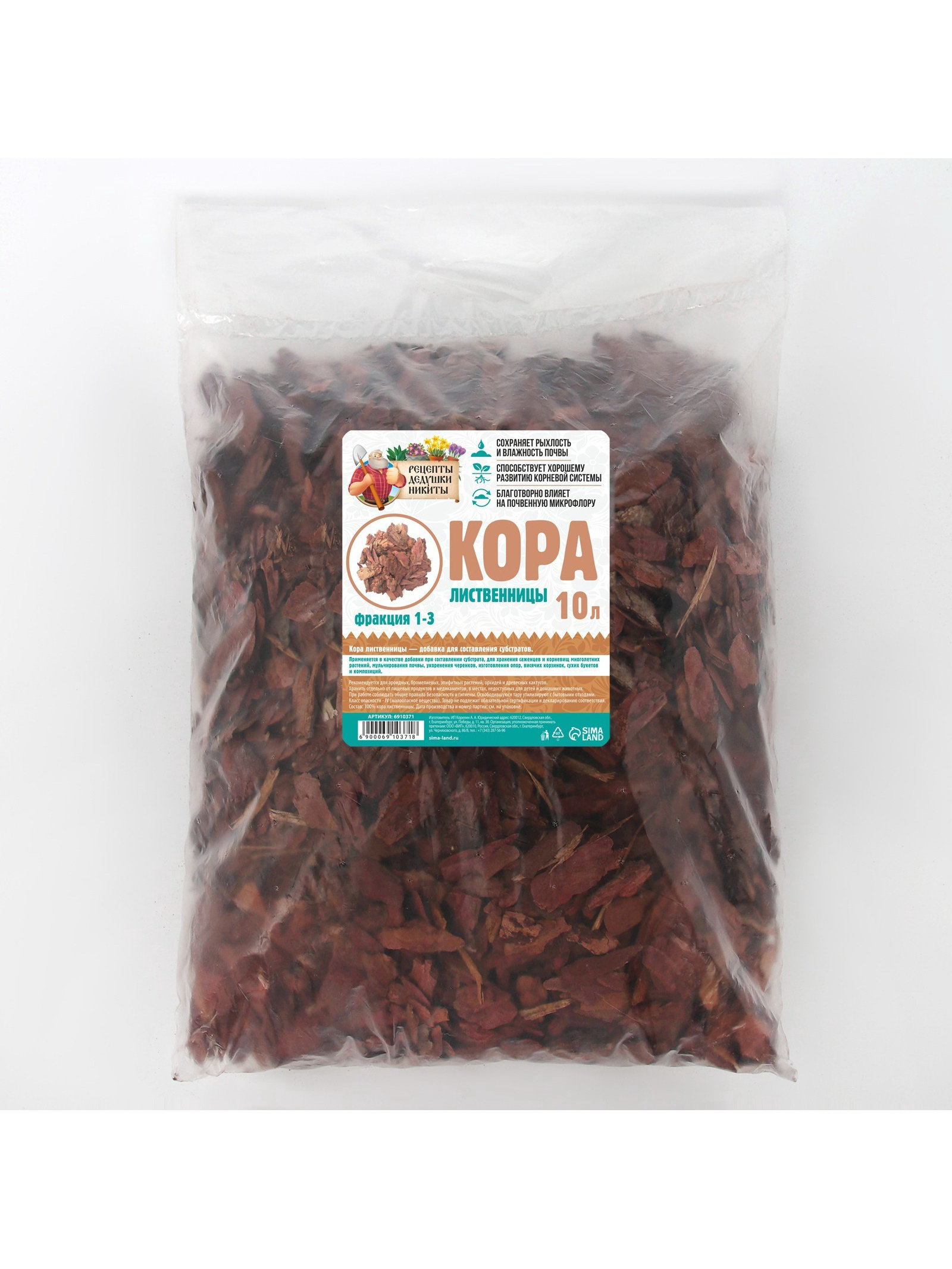 Представляет собой универсальное решение для ухода за растениями и улучшения почвы. Ее можно использовать как в садоводстве, так и в ландшафтном дизайне. Благодаря своим полезным свойствам, этот субстрат помогает создать благоприятные условия для роста растений и сохранения здоровья почвы. В заключение, кора лиственницы торговой марки ""Рецепты Дедушки Никиты"" является натуральным и эффективным субстратом для мульчирования почвы. Ее использование позволяет улучшить почву, защитить растения и создать здоровую экосистему в саду или на участке. "Условия хранения: хранить отдельно от пищевых продуктов и медикаментов в местах недоступных для детей и домашних животных. При работе соблюдать общие правила безопасности и гигиены. Освободившуюся тару утилизируют с бытовыми отходами. Класс опасности: IV (Малоопасное вещество). Состав: Кора лиственницы Срок годности: не ограничен. | ||