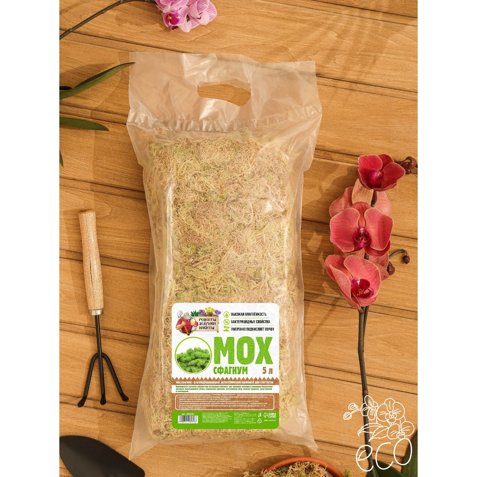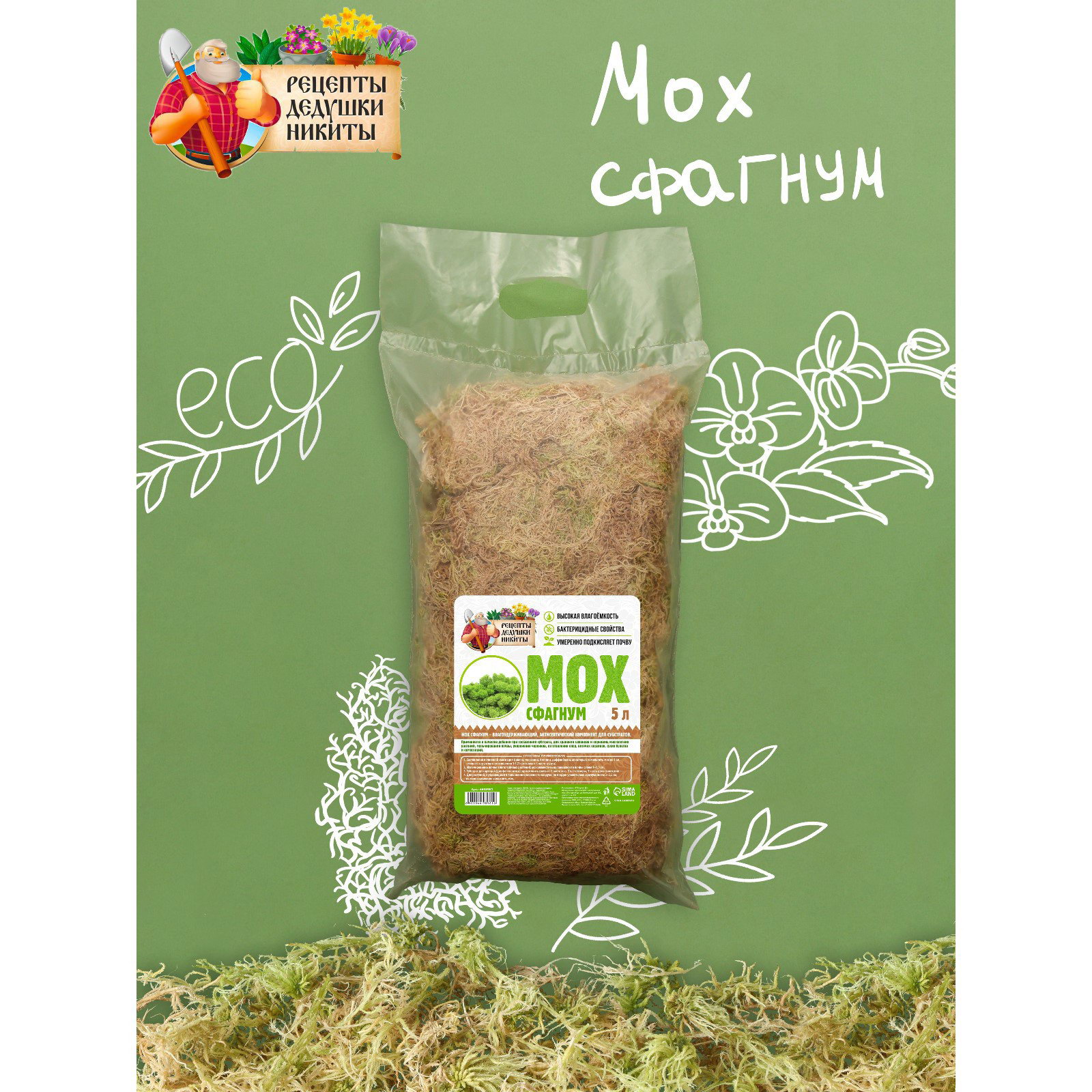 Мох сфагнум "Рецепты Дедушки Никиты" 5 л, Рецепты дедушки Никиты, Россия
