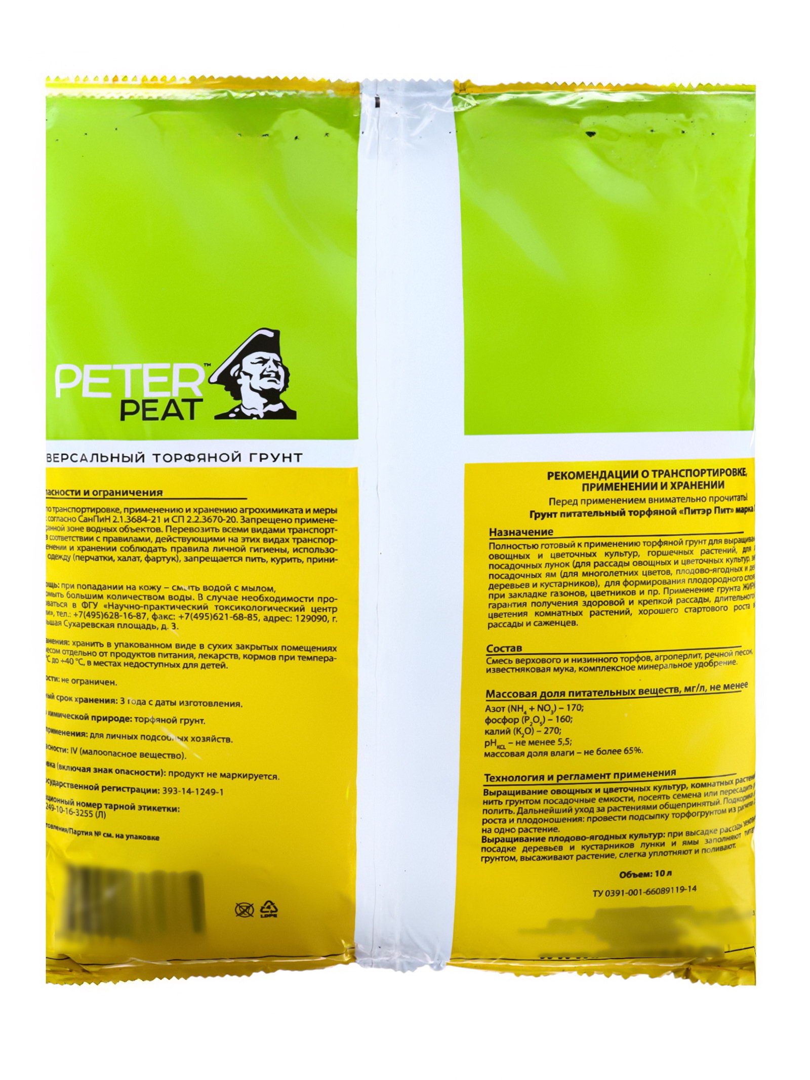 Размер упаковки: 31 x 5 x 40 см. tnved: 2703000000 Температурное ограничение: Нет Кислотность: Нейтральные (5.5-7 pH) Вес/Объём: 10 л Сатурн: Сатурн Назначение: полностью готовый к применению торфяной грунт для выращивания всех видов овощных, цветочных культур, плодовых деревьев и ягодных кустарников. Для заполнения посадочных ям и лунок, для формирования плодородного слоя в теплицах при закладке газонов, цветников и пр. Гарантирует активный рост и высокий урожай, обеспечивает развитие корневой системы, стимулирует все вегетативные процессы. Применение: заполнить грунтом посадочные емкости, посеять семена или пересадить растения, полить. Дальнейший уход за растениями общепринятый. Подкормка в период роста и плодоношения: провести подсыпку торфогрунтом из расчета 0,5-1,5 л на одно растение. Выращивание плодово-ягодных культур: при высадке земляники и посадке деревьев и кустарников лунки и ямы заполняют питательным грунтом, высаживают растение, слегка уплотняют и поливают. Состав: