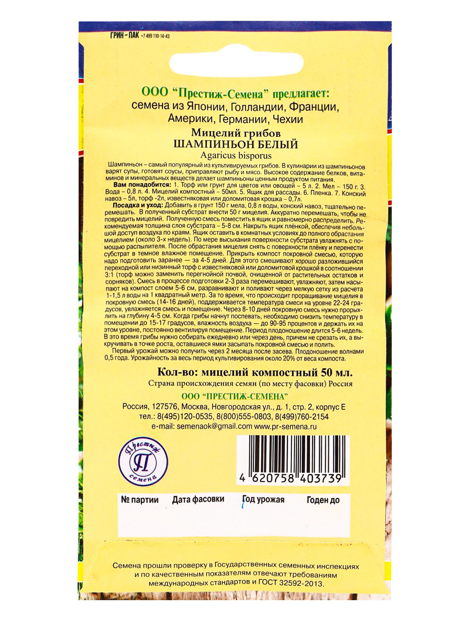Мицелий грибов Шампиньон белый, 50 мл, Престиж семена, Россия
