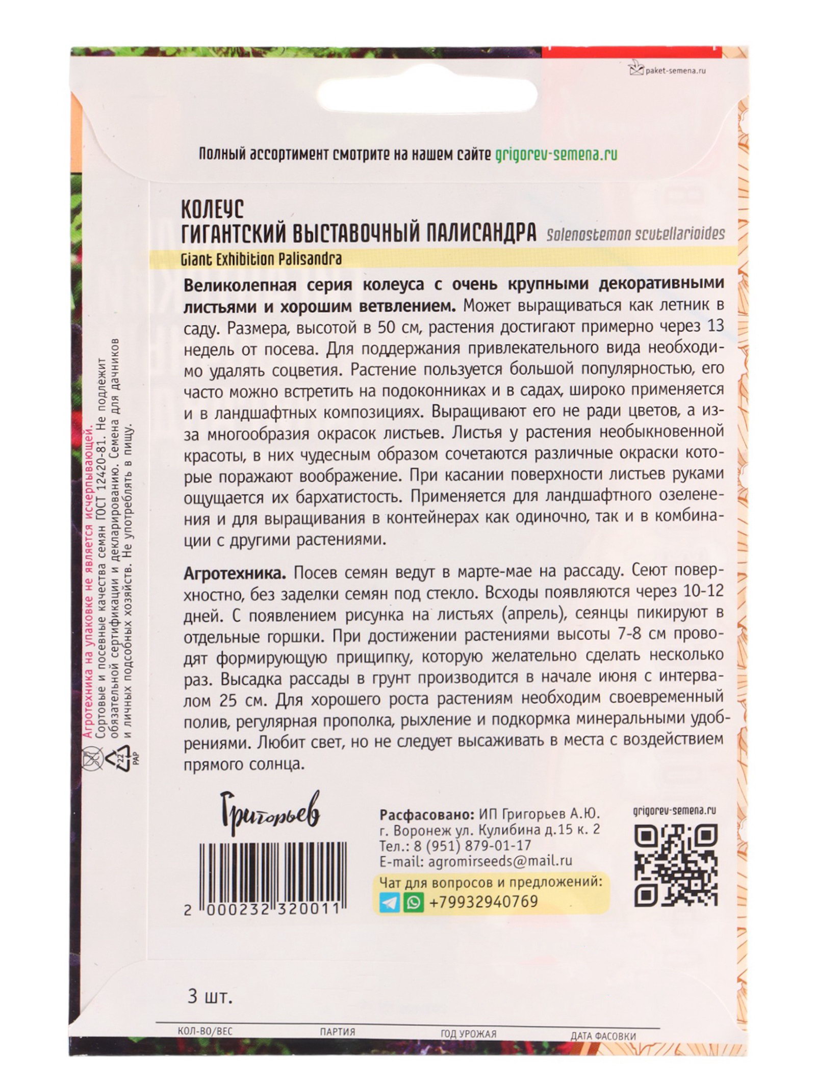 Семена цветов Колеус Гигантский Выставочный Палисандра, Григорьев, Россия