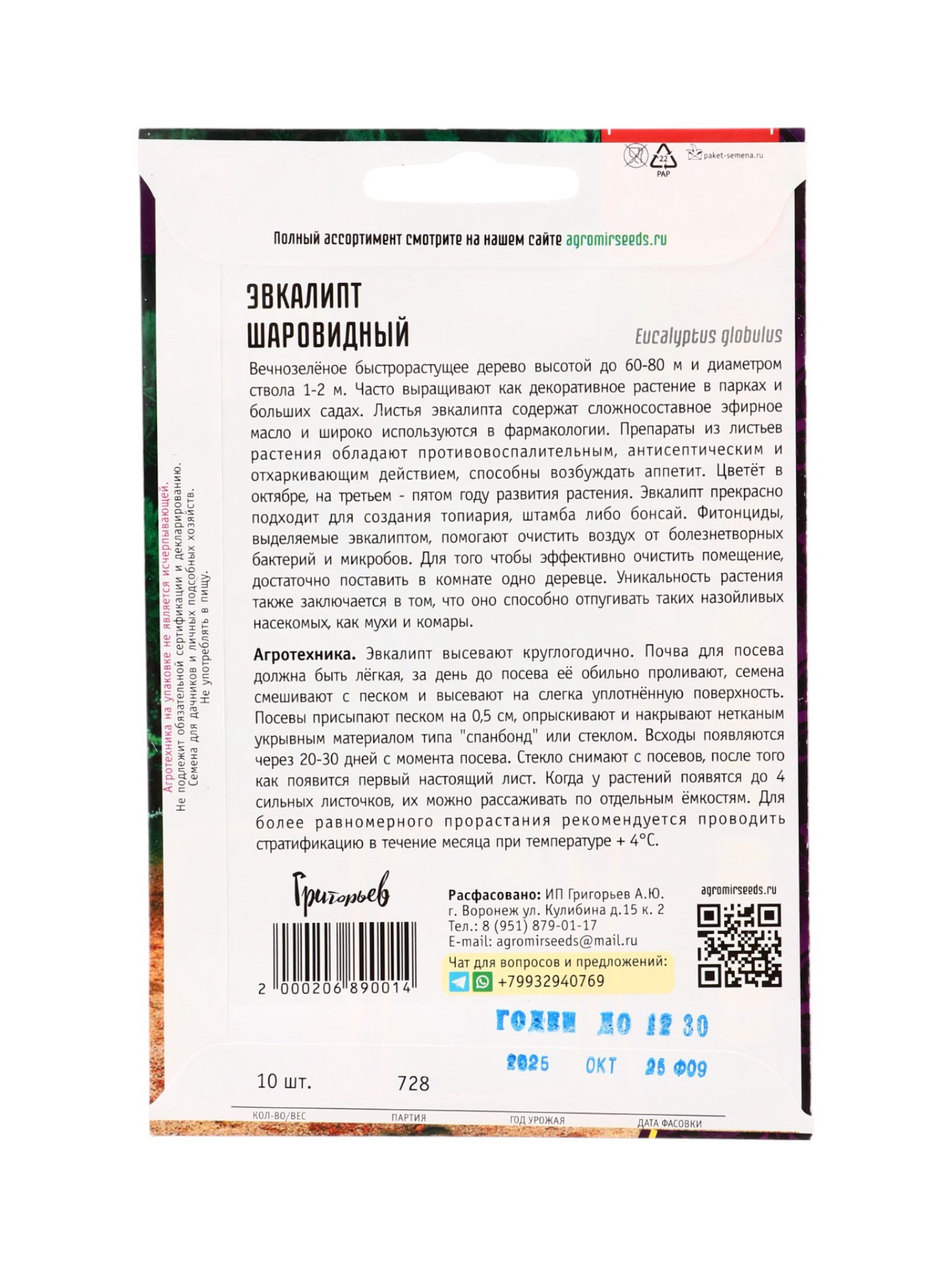 Семена Эвкалипт Шаровидный 10 шт. 12.29 гр, Григорьев, Россия