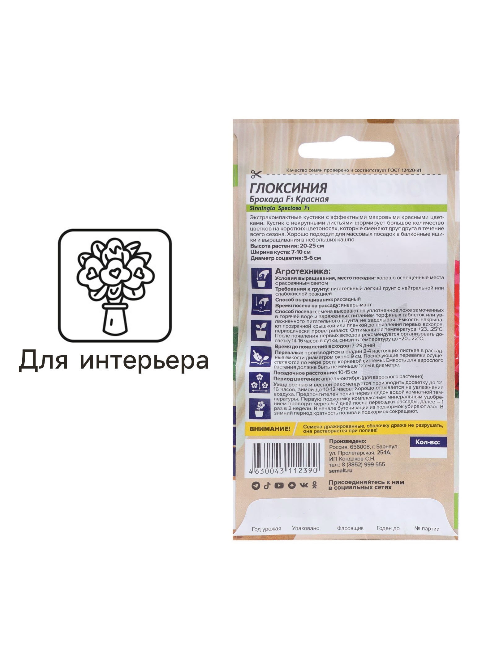 Семена комнатных цветов Глоксиния Брокада "Красная", ц/п, F1, 8 шт., Семена Алтая, Россия