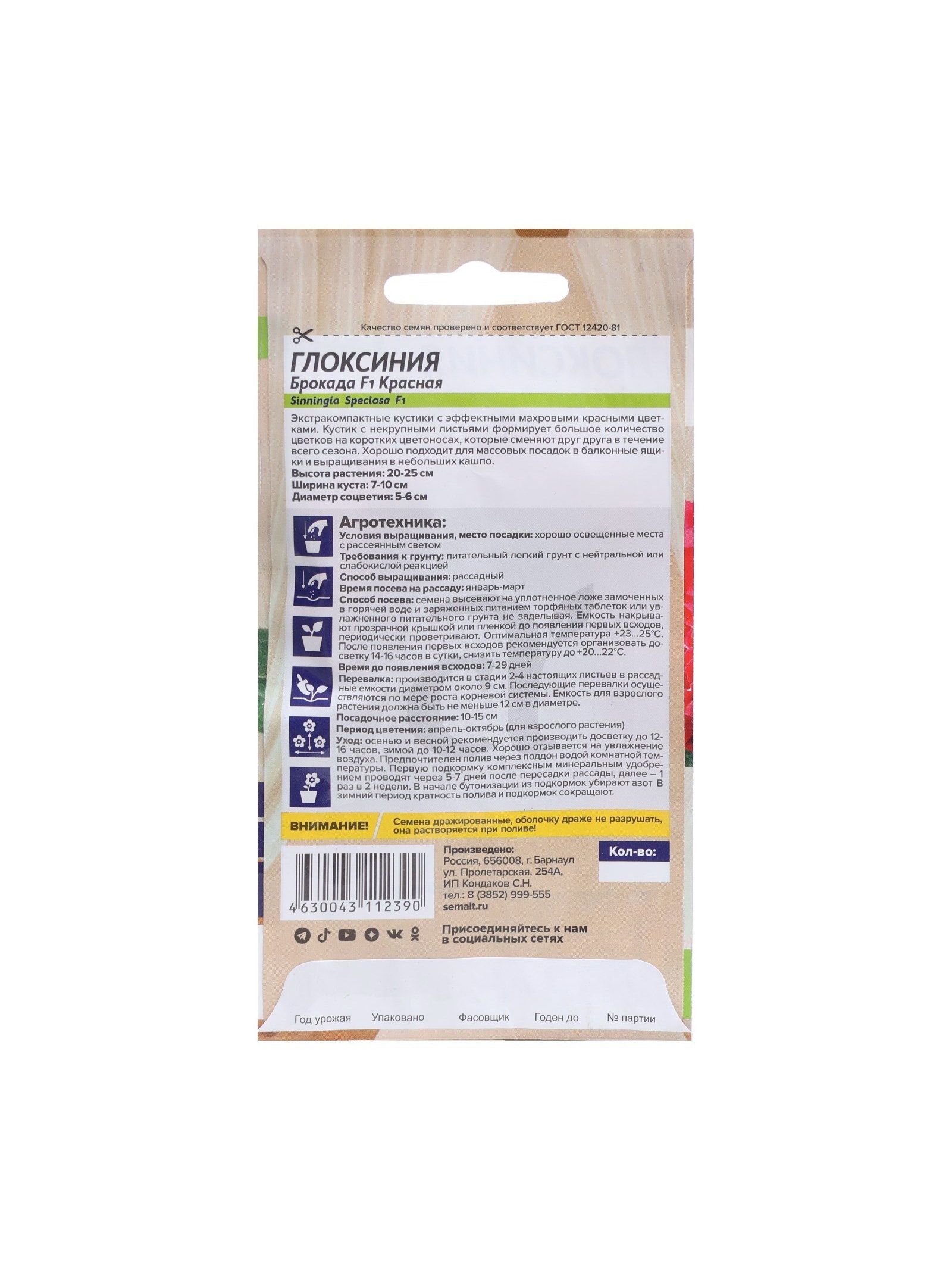 Цветение период: Ноябрь, Октябрь Размер упаковки: 8 x 15 x 0.3 см. Вегетация: Однолетники Вид: Глоксиния Тип: Комнатные Отношение к свету: Рассеянный свет По форме куста: Кустовая Махровые: Нет Подходит для балкона: Да tnved: 1209300000 tnved: 1209300000 Цвет: Красный Упаковка: Цветная Особенности выращивания: Закрытый грунт (теплицы, укрытия) Высота, см: 30 Агрономический срок годности, лет: 3 Эффектноцветущее комнатное растение привлекает необычной махровостью цветков. Собранные в розетку листья держат красные цветки, словно манжетой. Благодаря этому они смотрятся как букет и дольше не вянут. Сорт славится обильным цветением и неприхотливостью. Семена на рассаду сеют в январе-феврале, не заделывая землей, а просто накрывая ящики стеклом или полиэтиленовой пленкой для сохранения влажности. Всходы появляются только на свету при температуре 22-24℃ через 10-15 дней. Пока всходы мелкие, их лучше не поливать, а опрыскивать. Цветение наступает через 9-11 месяцев с момента появления всходов. Цветущим глоксиниям необходимо хорошее освещение, но от прямых солнечных лучей их лучше притенять. | ||