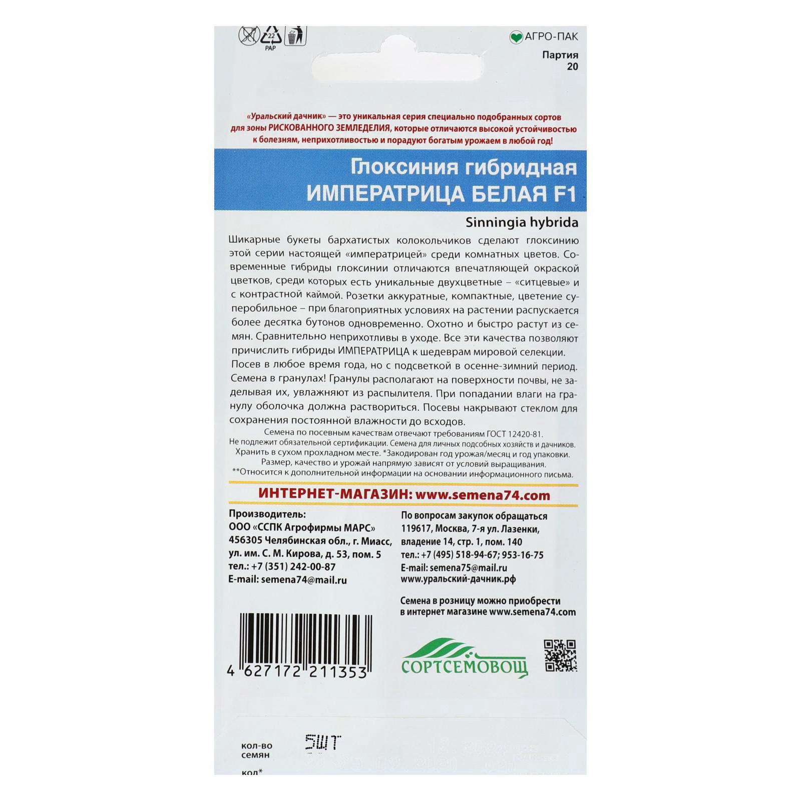 Семена комнатных цветов Глоксиния "Императрица Белая", F1, 5 шт., Уральский Дачник, Россия