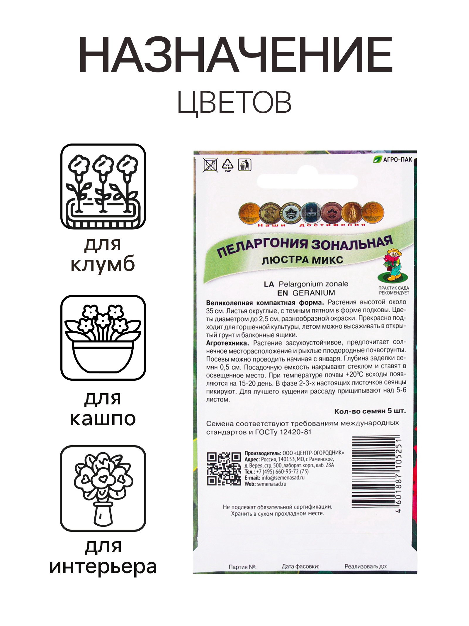 Цвет: Белый, Разноцветный, Розовый Размер упаковки: 8 x 0.1 x 15 см. Температурное ограничение: Нет Отношение к свету: Светолюбивые Агрономический срок годности, лет: 3 Подходит для балкона: Да По форме куста: Кустовая Вид: Пеларгония Махровые: Нет tnved: 1209300000 tnved: 1209300000 Микс семян пеларгонии "Зональная Люстра", включающий 5 семян, подарит вашему саду яркие и насыщенные краски. Эти цветы, известные великолепной палитрой и устойчивостью, станут истинным украшением любого участка. Пеларгонии легко выращивать, они цветут обильно и продолжительно, что особенно привлекательно для любителей садоводства. Преимущества