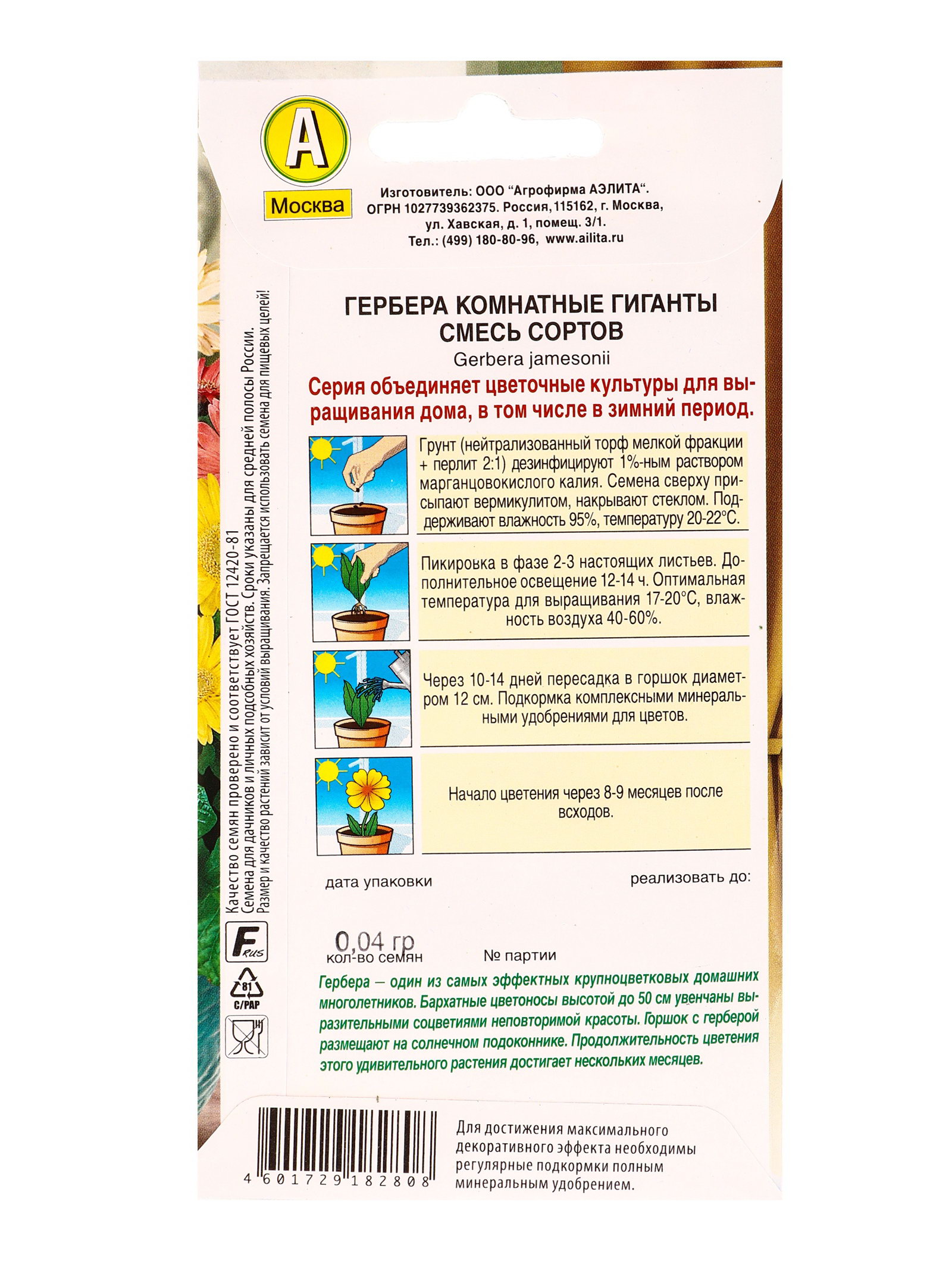 Семена цветов Гербера Комнатные гиганты, смесь сортов Мн Зимний сад, Ц/П,0.04 г, Агрофирма АЭЛИТА, Нидерланды