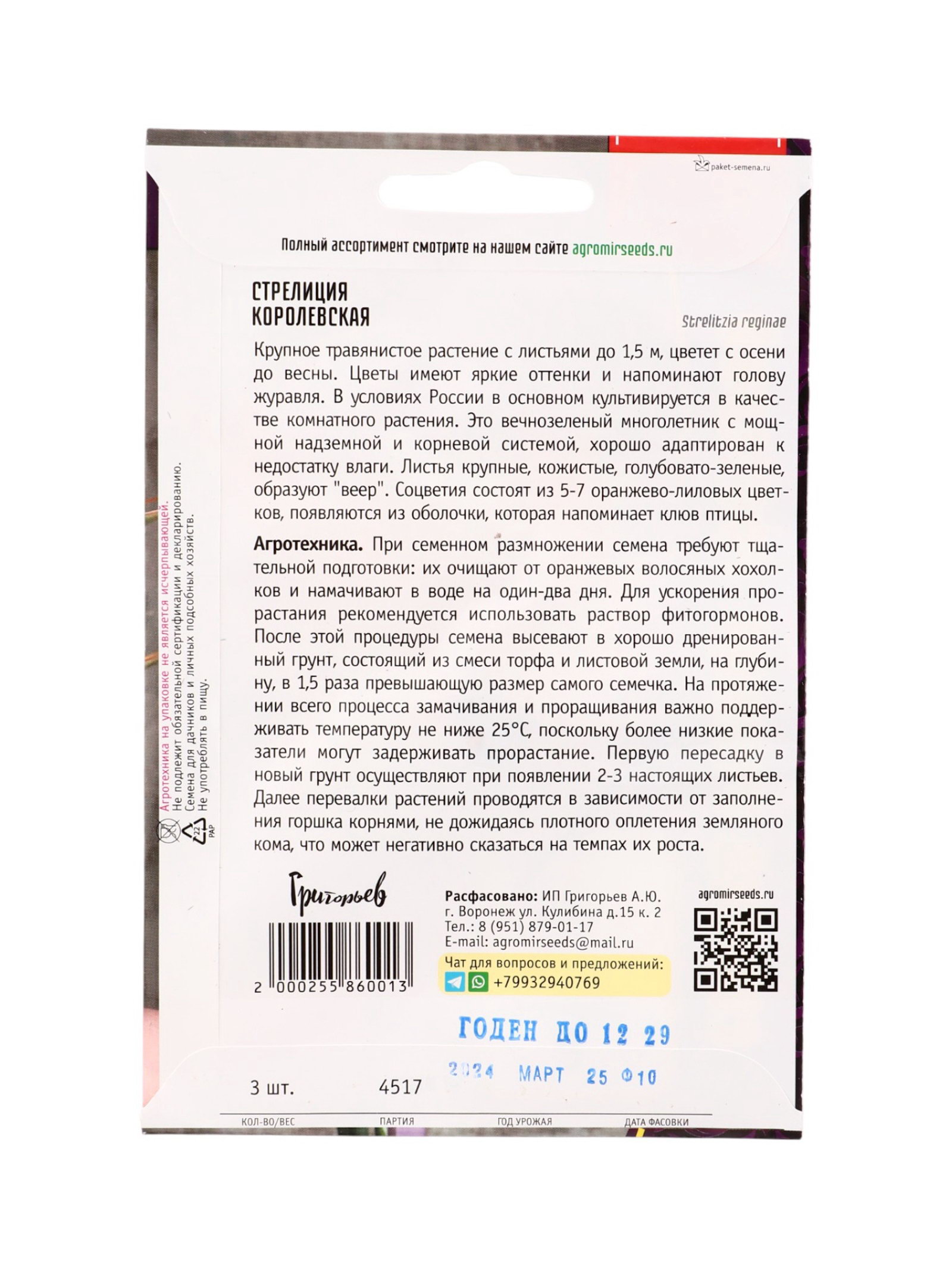 Семена цветов Стрелиция Королевская 3 шт. / НОВИНКА 12.29 гр, Григорьев, Россия