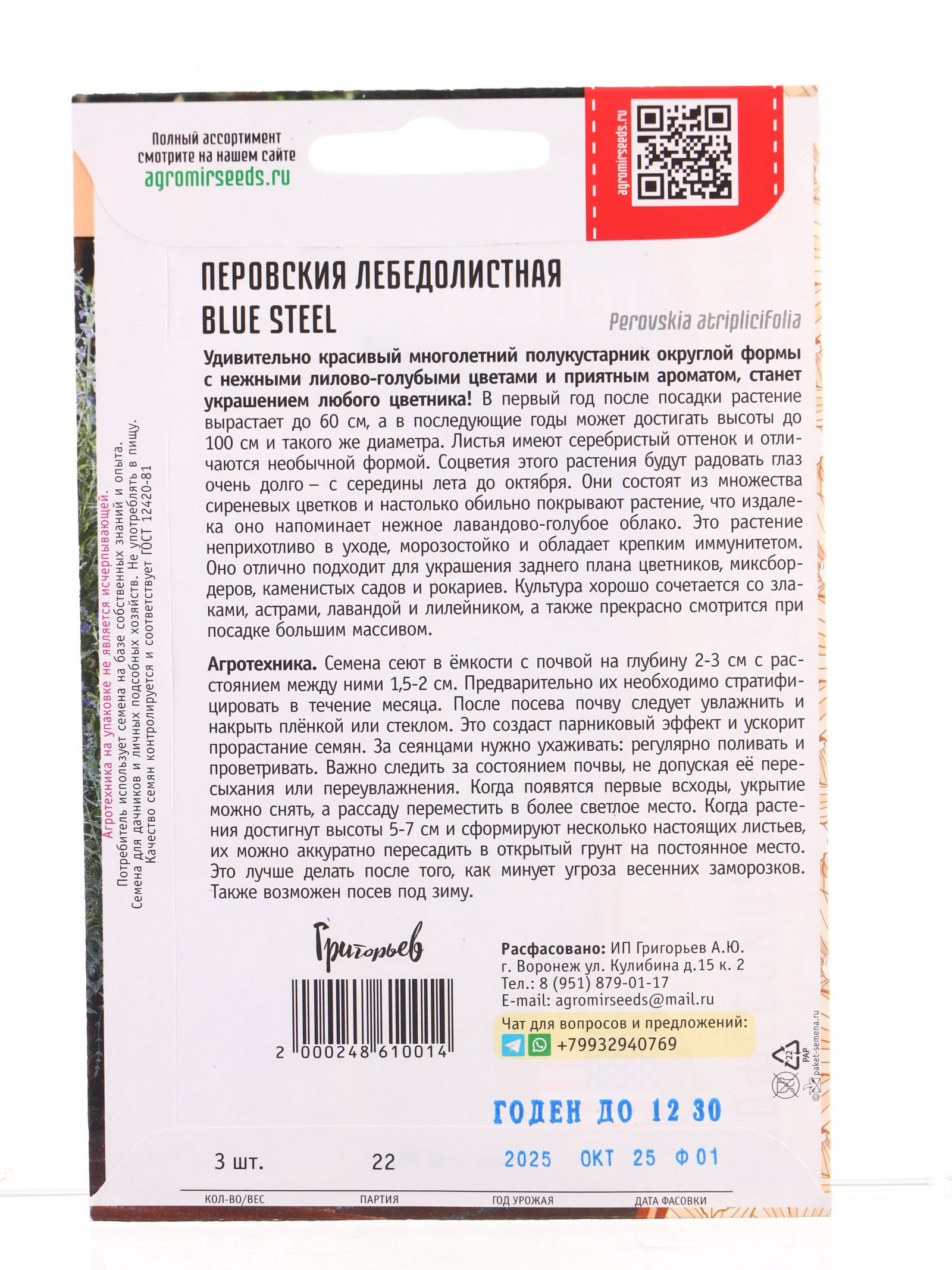 Размер упаковки: 11.5 x 0.1 x 15 см. tnved: 1209918000 Температурное ограничение: Нет Вид: Перовския Место выращивания: Открытый грунт Цвет: Синий Махровые: Нет Отношение к свету: Светолюбивые Подходит для балкона: Нет Высота растений: 60-100 см По форме куста: Кустовая | ||