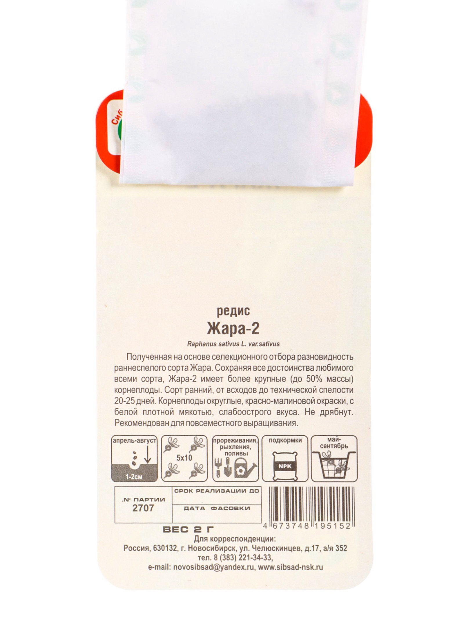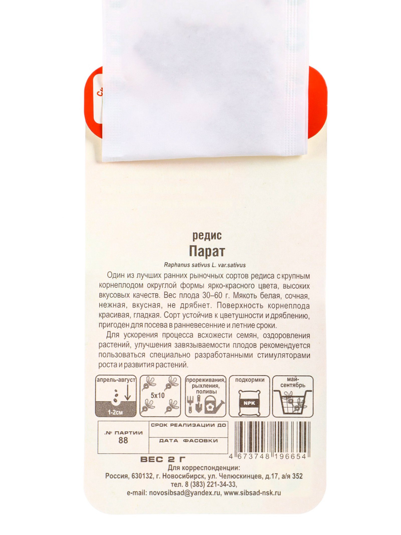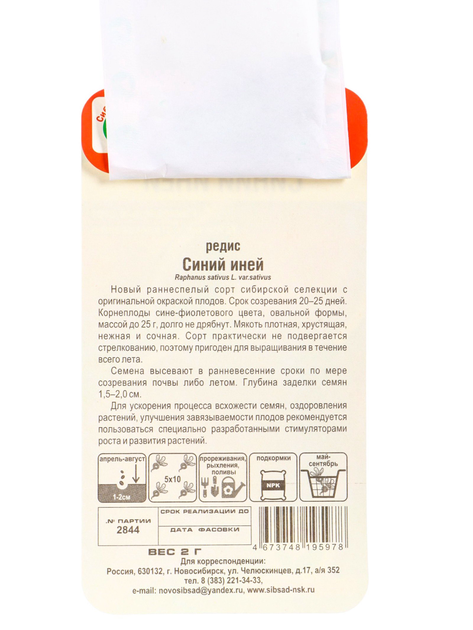 Размер упаковки: 8 x 2 x 15 см. tnved: 1209999900 Запрет реализации по сегментам: 00000000578 Вид: Редис Место выращивания: Открытый грунт | ||