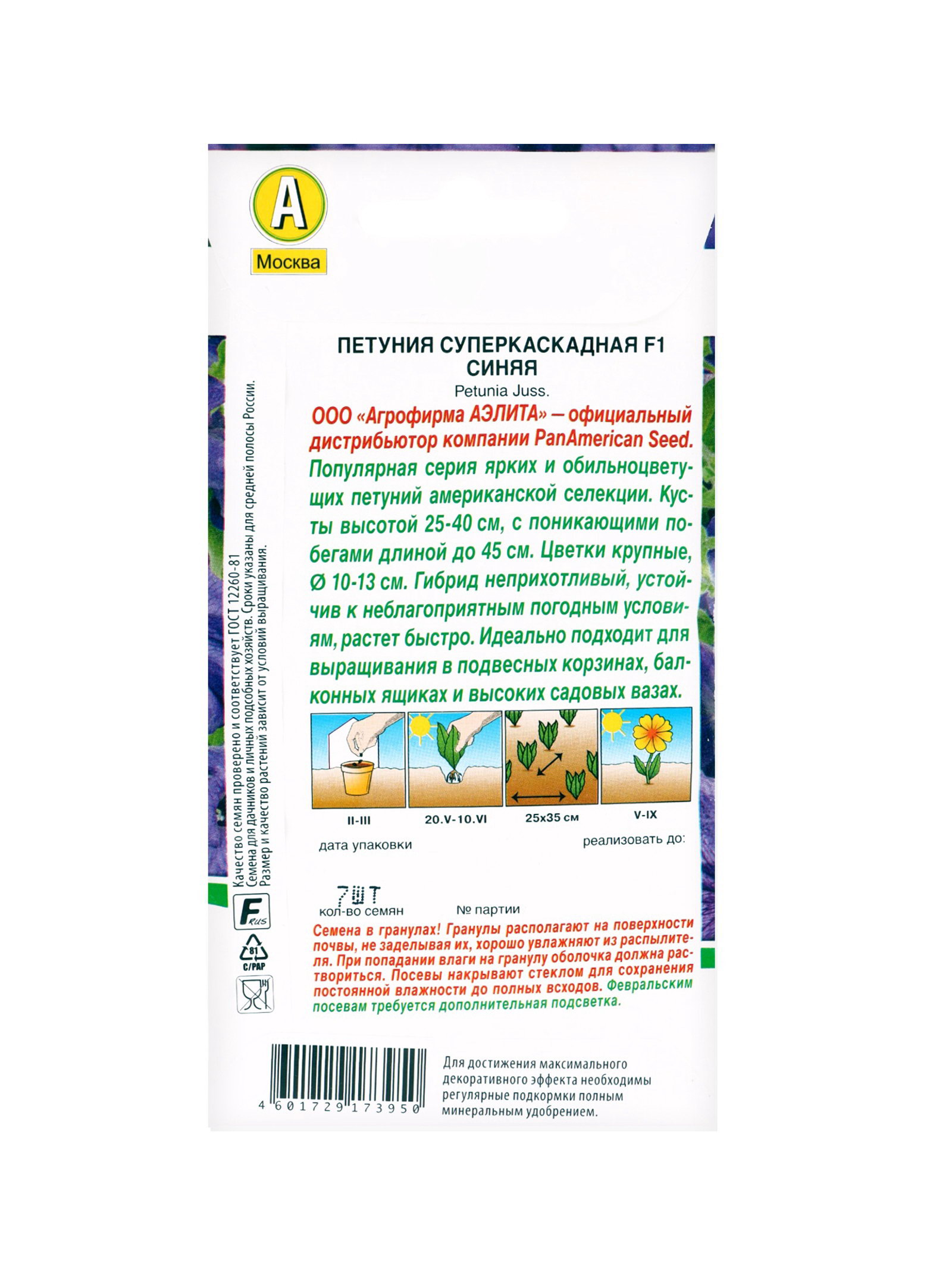 Размер упаковки: 8 x 3 x 15 см. tnved: 1209999900 Запрет реализации по сегментам: 00000000578 Место выращивания: Подоконник, балкон Вид: Петуния Набор семян ампельной петунии - это коллекция сортов с каскадной формой роста, созданная для вертикального озеленения. Длинные, ниспадающие побеги, сплошь усыпанные граммофончиками различных оттенков, превратят подоконник, балкон или террасу в настоящий висячий сад.