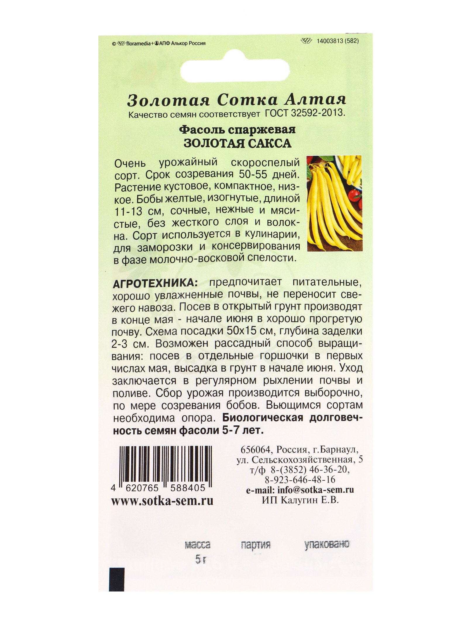 Семена Фасоль "Золотая Сакса", 5 г, Золотая Сотка Алтая, Россия