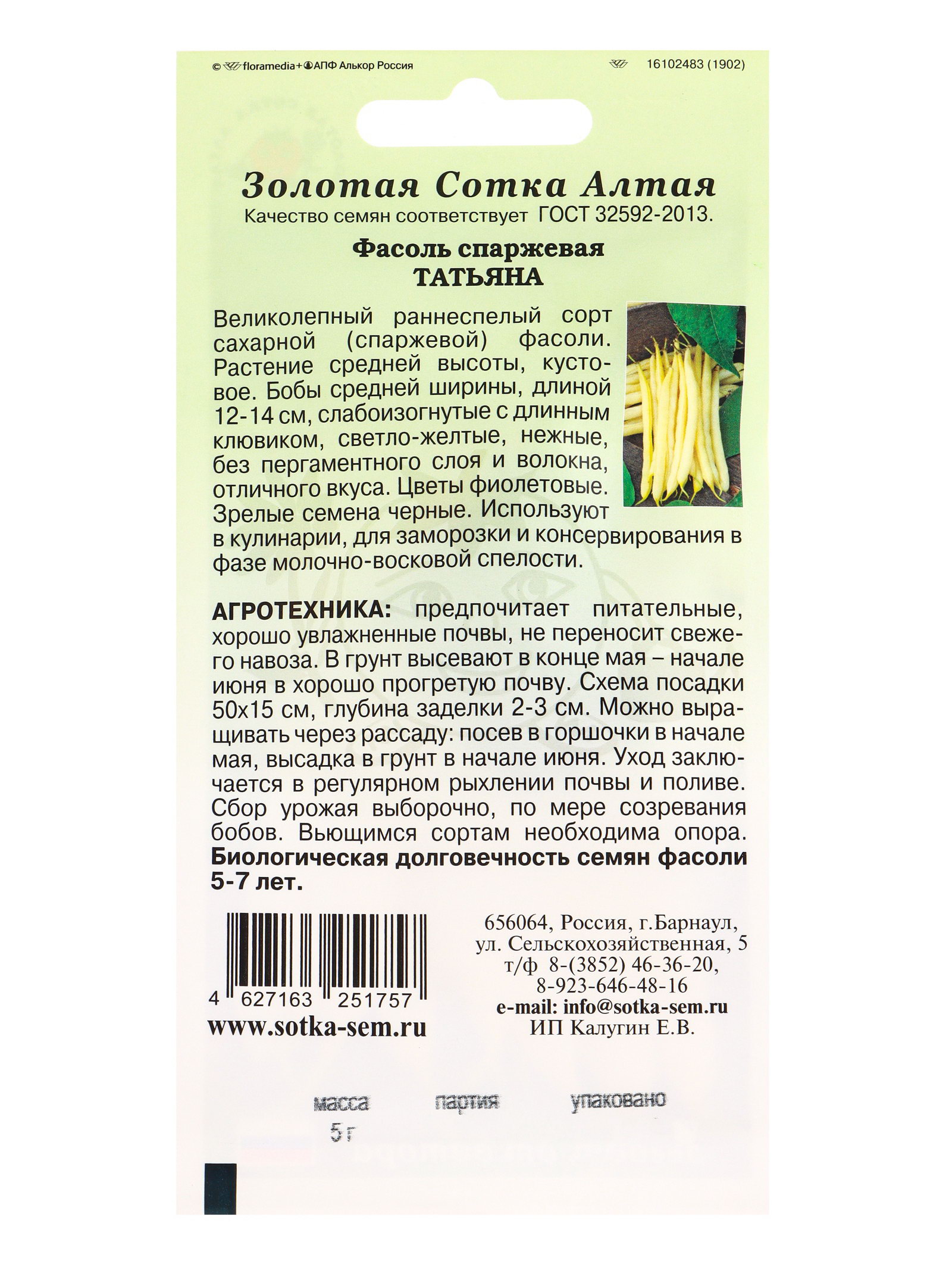 Семена Фасоль Татьяна /Сотка/ 5 г /спарж/*400, Золотая Сотка Алтая, Россия