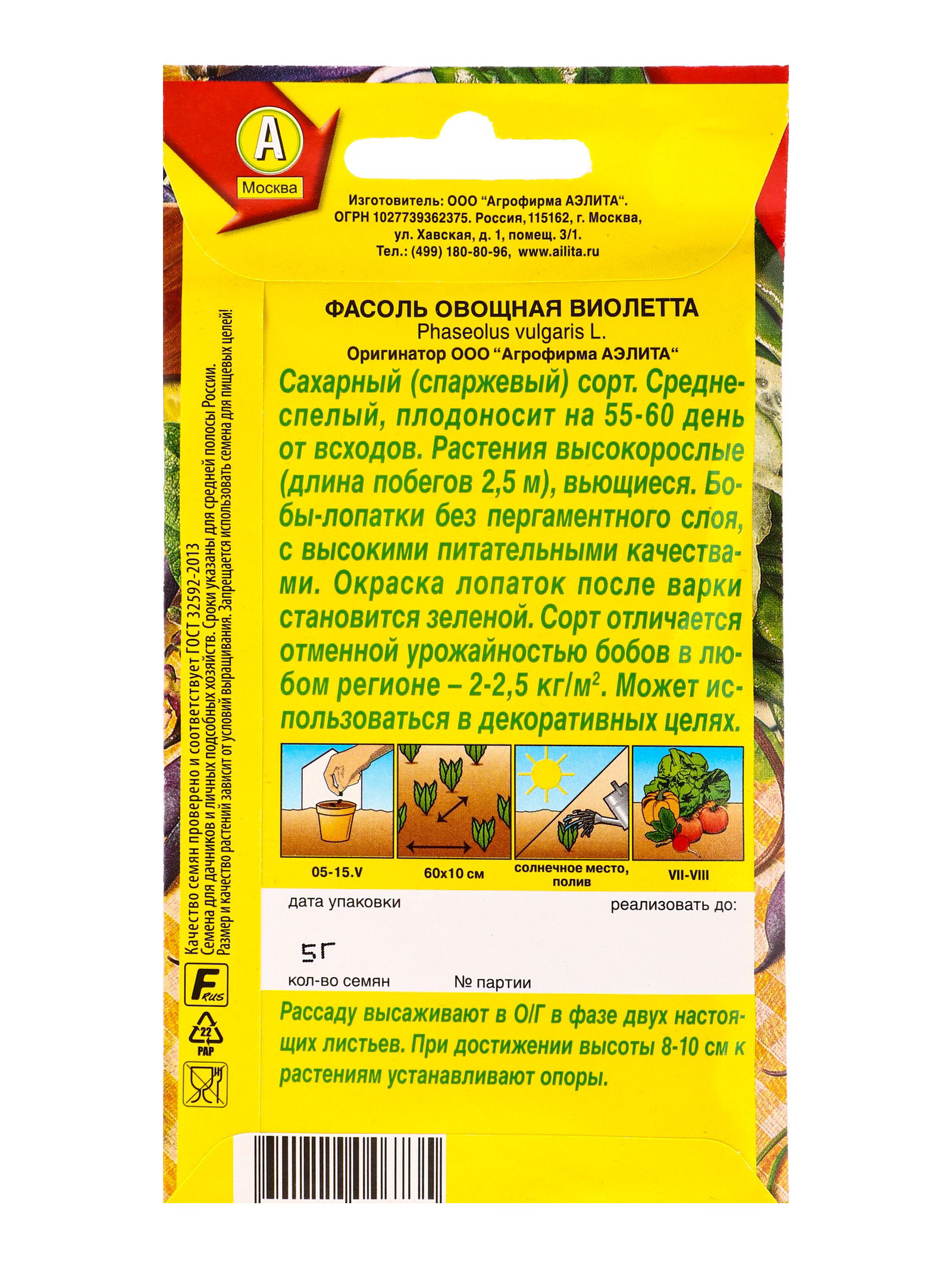 Семена Фасоль овощная Виолетта Ор. А, Ц/П,5 г, Агрофирма АЭЛИТА, Китай