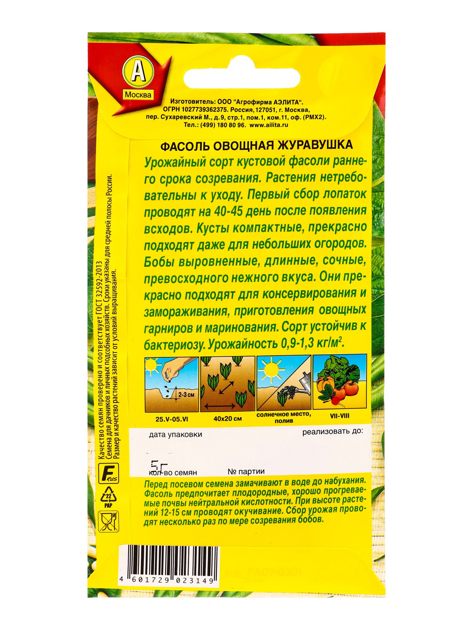 Семена Фасоль овощная Журавушка, Ц/П,5 г, Агрофирма АЭЛИТА, Китай