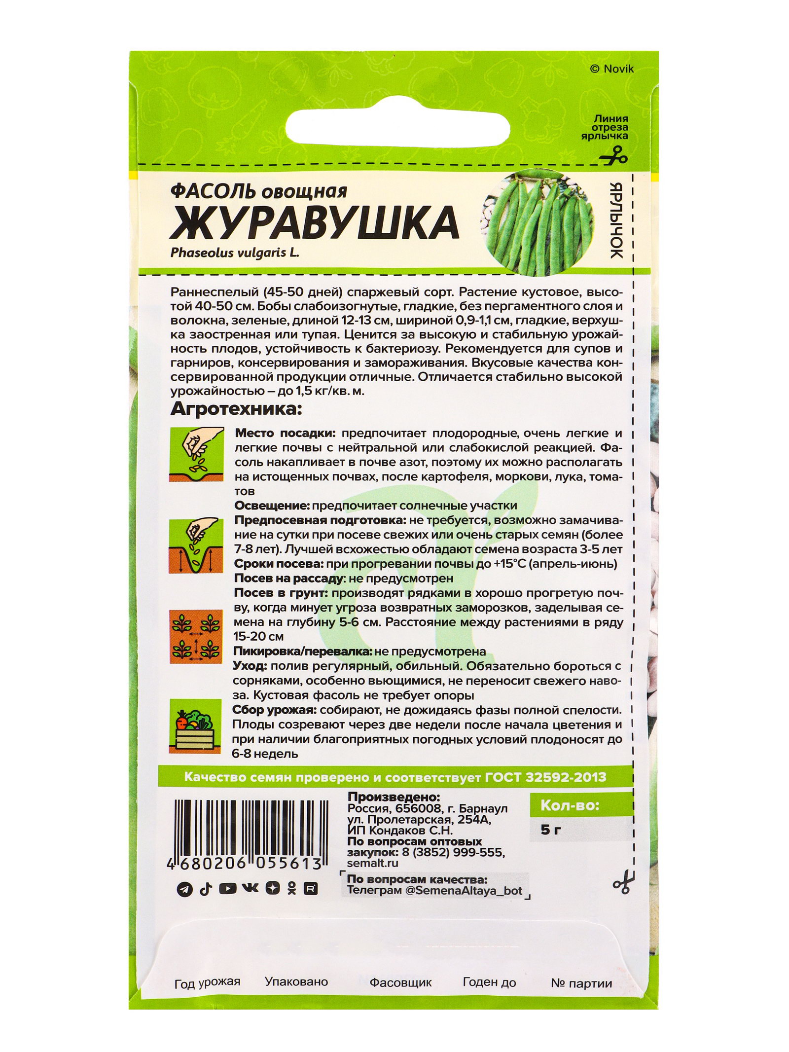 Фасоль Журавушка/Сем Алт/цп 5 гр, Семена Алтая, Россия