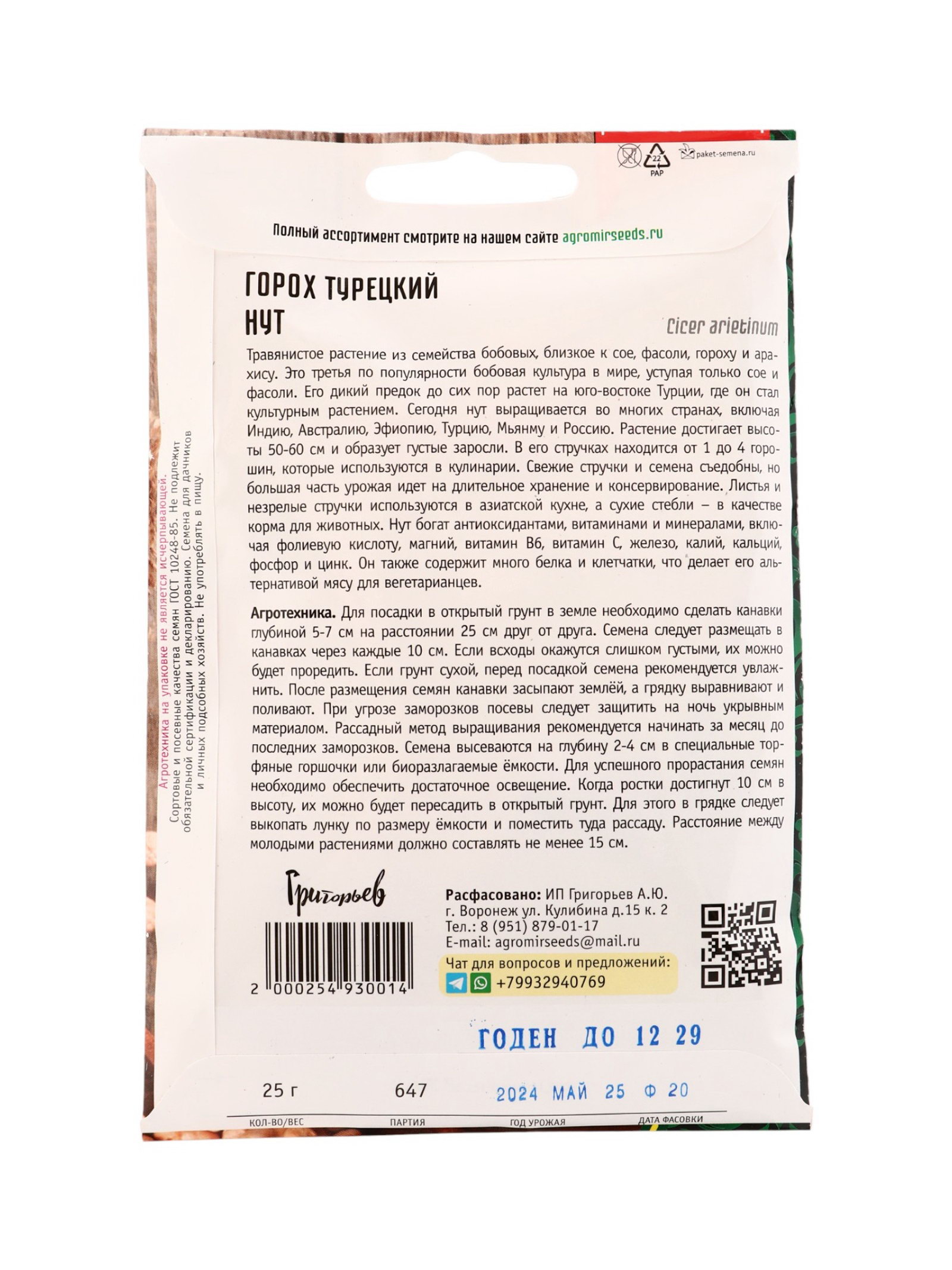 Семена цветов Горох Нут турецкий 25 г 12.29 гр, Григорьев, Россия