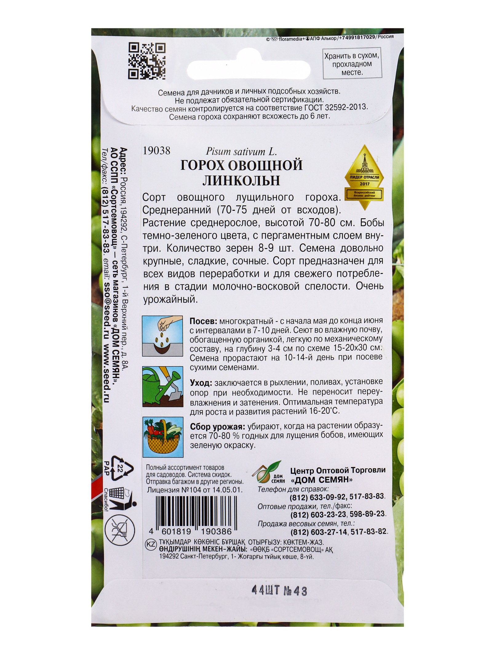 Семена Горох овощной сладкий Линкольн 44 шт, Дом семян, Россия