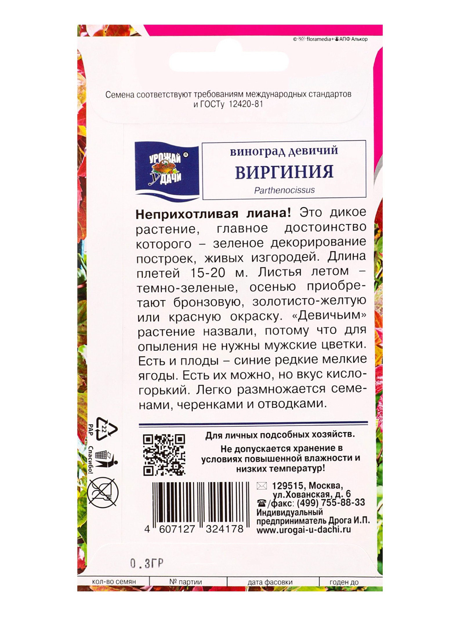 Семена Виноград девичий "Виргиния", 0.3 г, УРОЖАЙ УДАЧИ, Россия