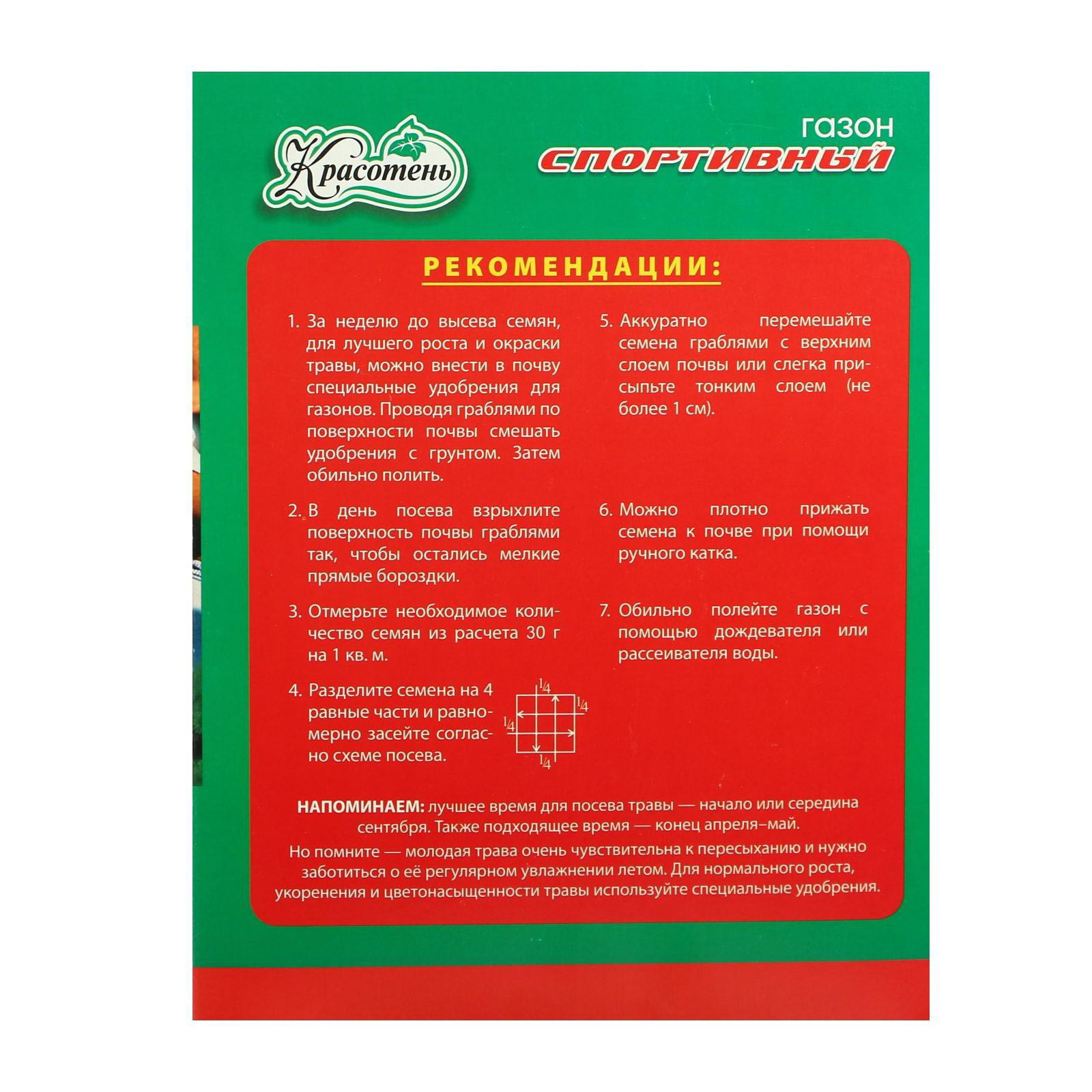 Посев (посадка) в грунт: Август, Июнь, Май, Сентябрь Состав газонных трав: Мятлик луговой, Овсяница красная, Овсяница луговая, Райграс пастбищный, Тимофеевка луговая Размер упаковки: 10 x 25 x 20 см. Особенности выращивания: Открытый грунт Вид: Семечки Вес/Объём: 1 кг Вес/Объём: 1 кг tnved: 1209291000 Температурное ограничение: Нет Агрономический срок годности, лет: 2 Площадь, ?2: 30 Особенности газона: Износоустойчивый Вес, кг: 1 Спортивный газон отличается прочностью, что позволяет использовать его в местах занятия спортом. Многолетние злаки, выращенные на Урале. Хорошо зарекомендовали себя в холодном и умеренном поясах. Все семена прошли испытания на всхожесть, проверены семенной и карантинной инспекциями. Стандартный расход: 1000 гр на 30 м2 Рекомендации:
