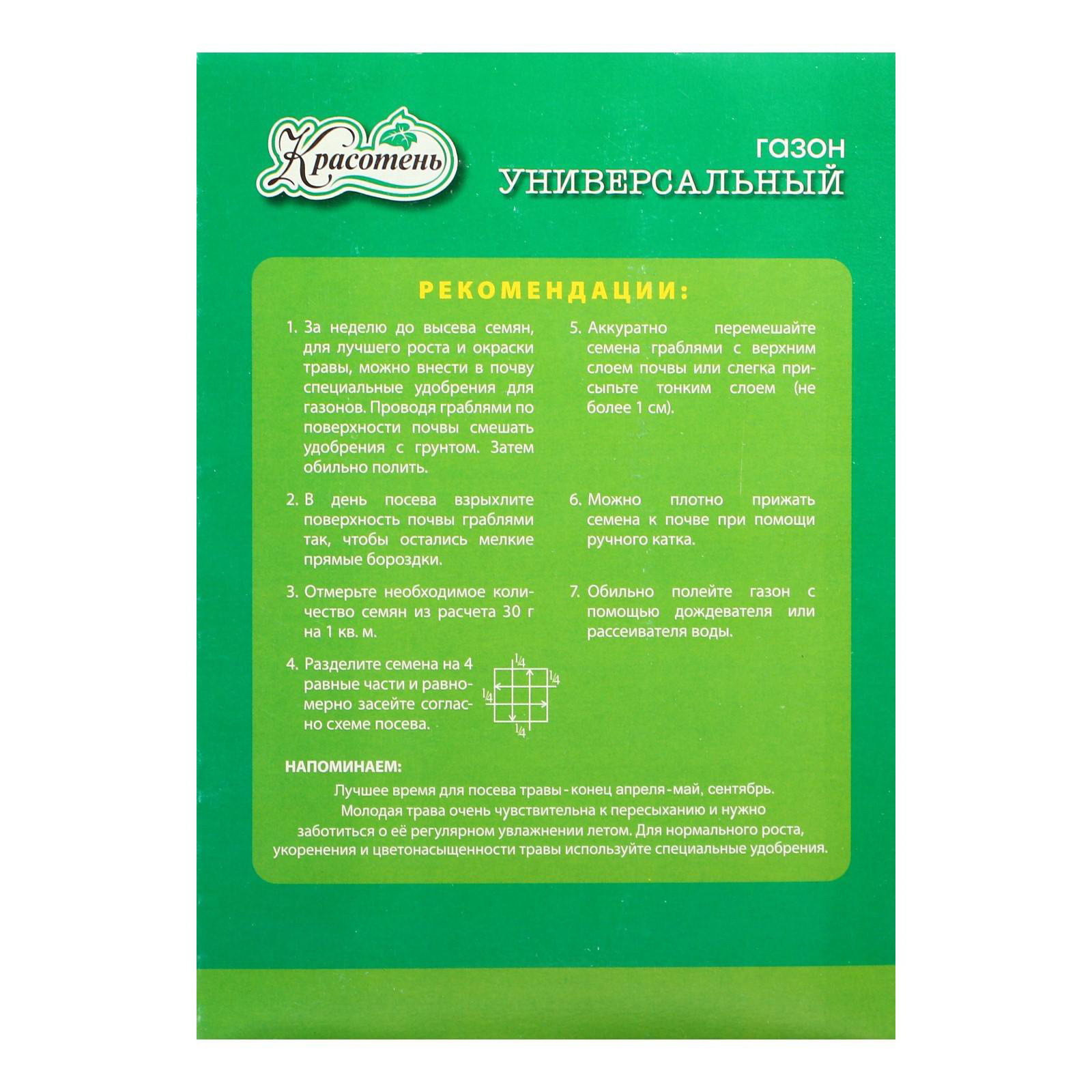 Посев (посадка) в грунт: Август, Июнь, Май, Сентябрь Состав газонных трав: Мятлик луговой, Овсяница красная, Овсяница луговая, Тимофеевка луговая Размер упаковки: 13.5 x 20 x 9 см. Место выращивания: Открытый грунт Вес/Объём: 500 г Вид: Семечки tnved: 1209291000 tnved: 1209291000 Температурное ограничение: Нет Площадь, ?2: 15 Особенности газона: Универсальный Вес, кг: 0.5 Универсальный газон не прихотлив в использовании. Многолетние злаки, выращенные на Урале. Хорошо зарекомендовали себя в холодном и умеренном поясах. Все семена прошли испытания на всхожесть, проверены семенной и карантинной инспекциями. Стандартный расход: 1000 гр на 30 м2 Рекомендации: