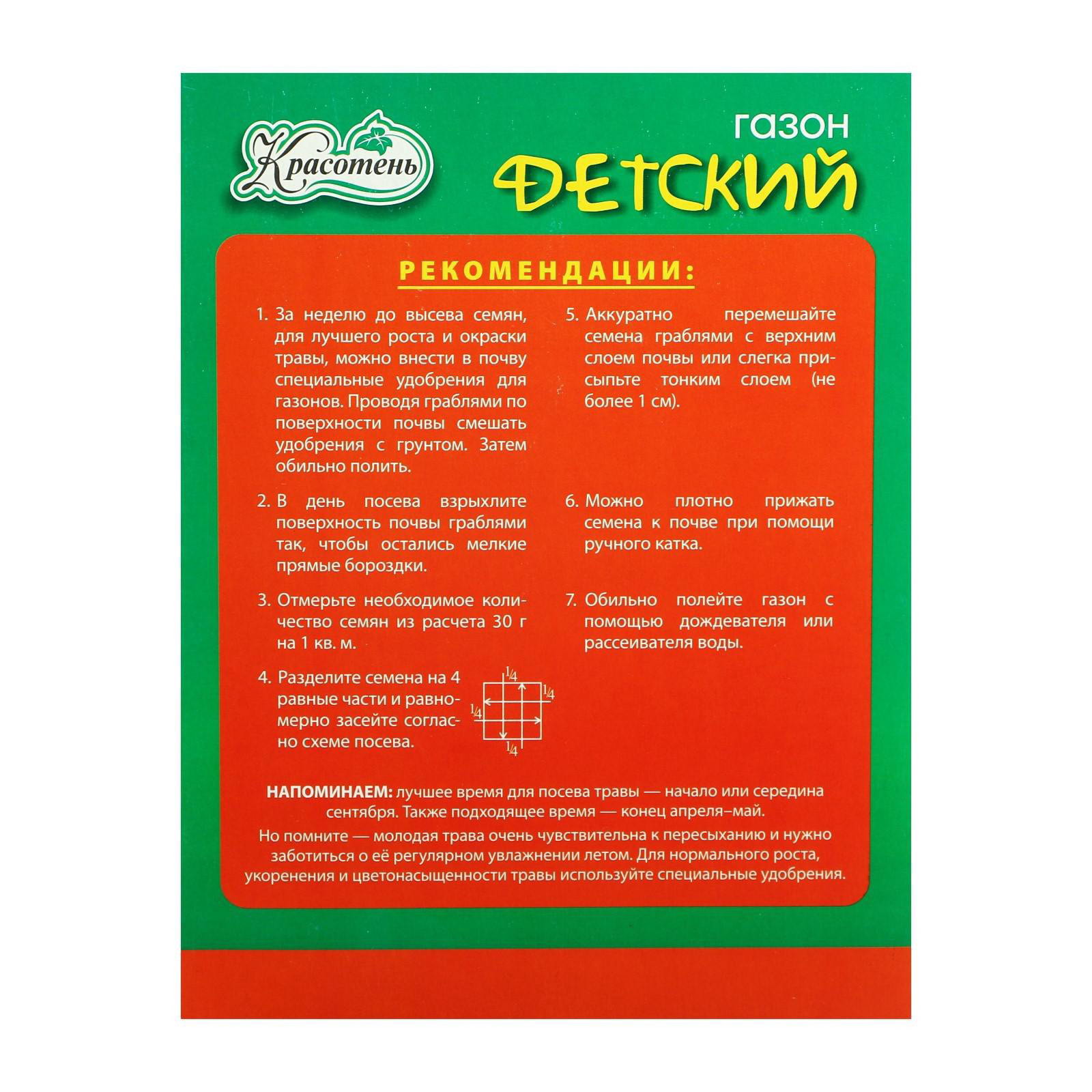Посев (посадка) в грунт: Август, Июнь, Май, Сентябрь Состав газонных трав: Мятлик луговой, Овсяница красная, Овсяница луговая, Райграс пастбищный, Тимофеевка луговая Размер упаковки: 10 x 25 x 20 см. Особенности выращивания: Открытый грунт Вес/Объём: 1 кг Вид: Семечки Вид: Семечки tnved: 1209291000 Температурное ограничение: Нет Агрономический срок годности, лет: 2 Площадь, ?2: 30 Особенности газона: Универсальный Вес, кг: 1 Детский газон отличается своей мягкостью и прочностью, что позволяет использовать его в местах отдыха детей, без опасения за их здоровье. Многолетние злаки, выращенные на Урале. Хорошо зарекомендовали себя в холодном и умеренном поясах. Все семена прошли испытания на всхожесть, проверены семенной и карантинной инспекциями. Стандартный расход: 1000 гр на 30 м2 Рекомендации: