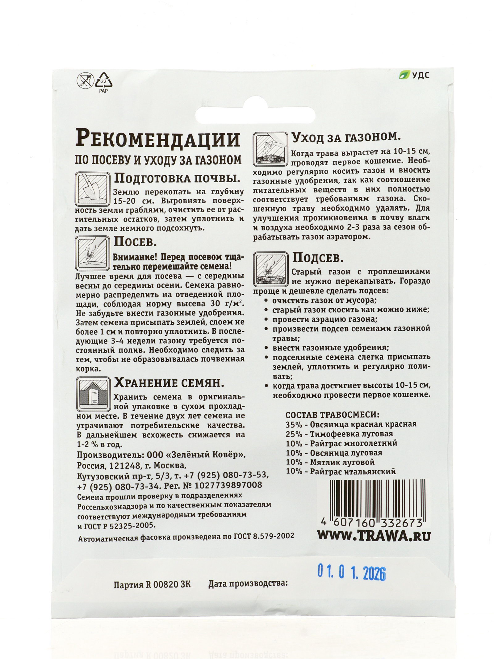 Посев (посадка) в грунт: Август, Июль, Июнь, Май, Сентябрь Размер упаковки: 11 x 0.5 x 15 см. tnved: 1209999900 Температурное ограничение: Нет Место выращивания: Открытый грунт Вес/Объём: 30 г Состав газонных трав: Овсяница красная Особенности газона: Универсальный Площадь, ?2: 1 Универсальная газонная смесь «Зеленый квадрат» - это компактная упаковка для тех, кому нужно засеять небольшую площадь или провести ремонт уже существующего газона. На основе овсяницы красной, смесь формирует плотный, изумрудный травяной ковер. Пакета 30 г достаточно для засева 1 м².