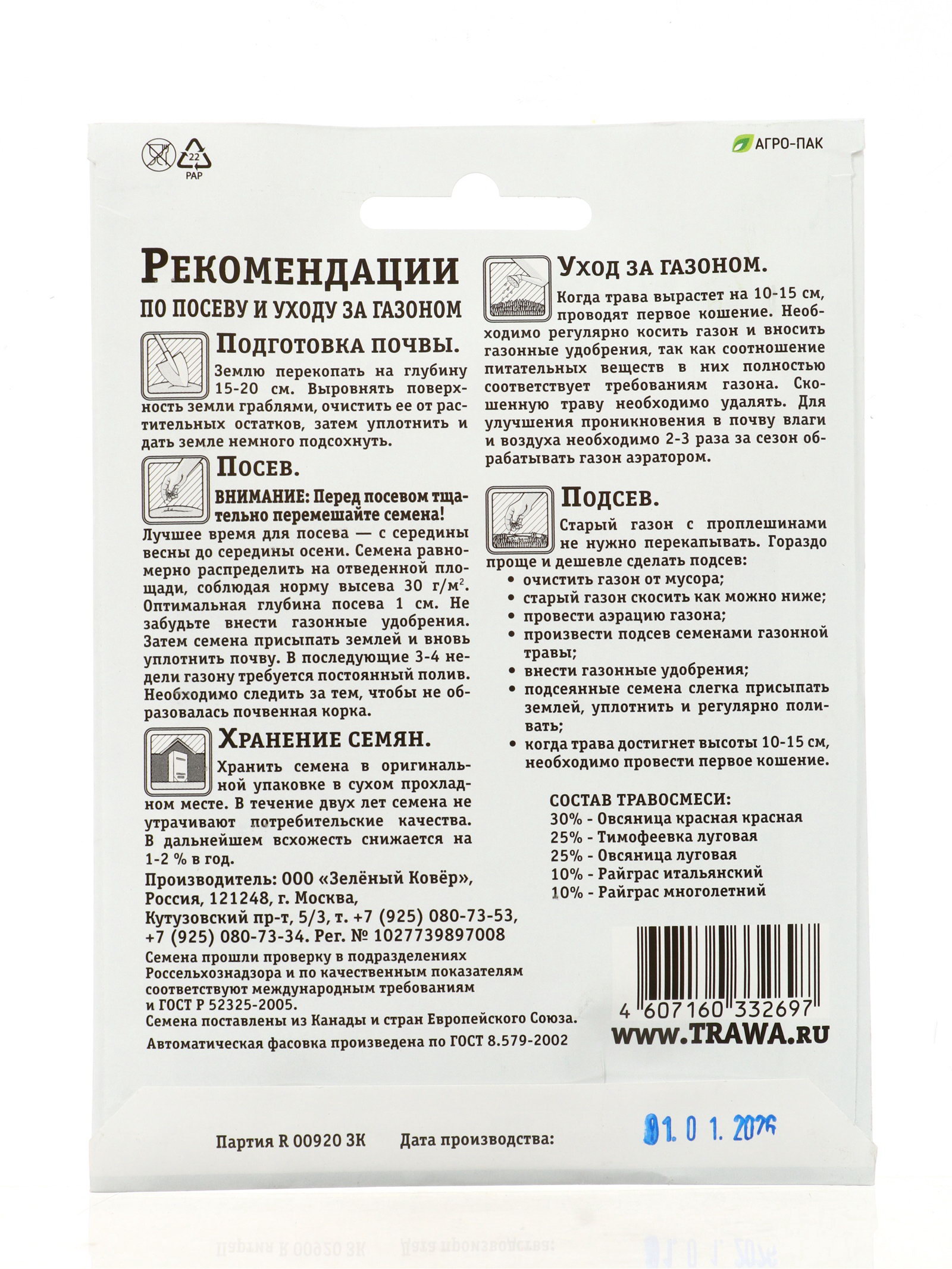 Состав газонных трав: Овсяница красная, Овсяница луговая, Тимофеевка луговая Посев (посадка) в грунт: Август, Июль, Июнь, Май, Сентябрь Размер упаковки: 11 x 0.5 x 15 см. tnved: 1209999900 Температурное ограничение: Нет Место выращивания: Открытый грунт Площадь, ?2: 30 Вес/Объём: 30 г Особенности газона: Универсальный Декоративная газонная смесь «Зеленый квадрат» - это компактное решение для создания ухоженного, красивого газона на небольшой площади. Состав на основе овсяницы красной, тимофеевки луговой и овсяницы луговой формирует плотный, изумрудный травяной ковер. Упаковки 30 г достаточно для засева 30 м².