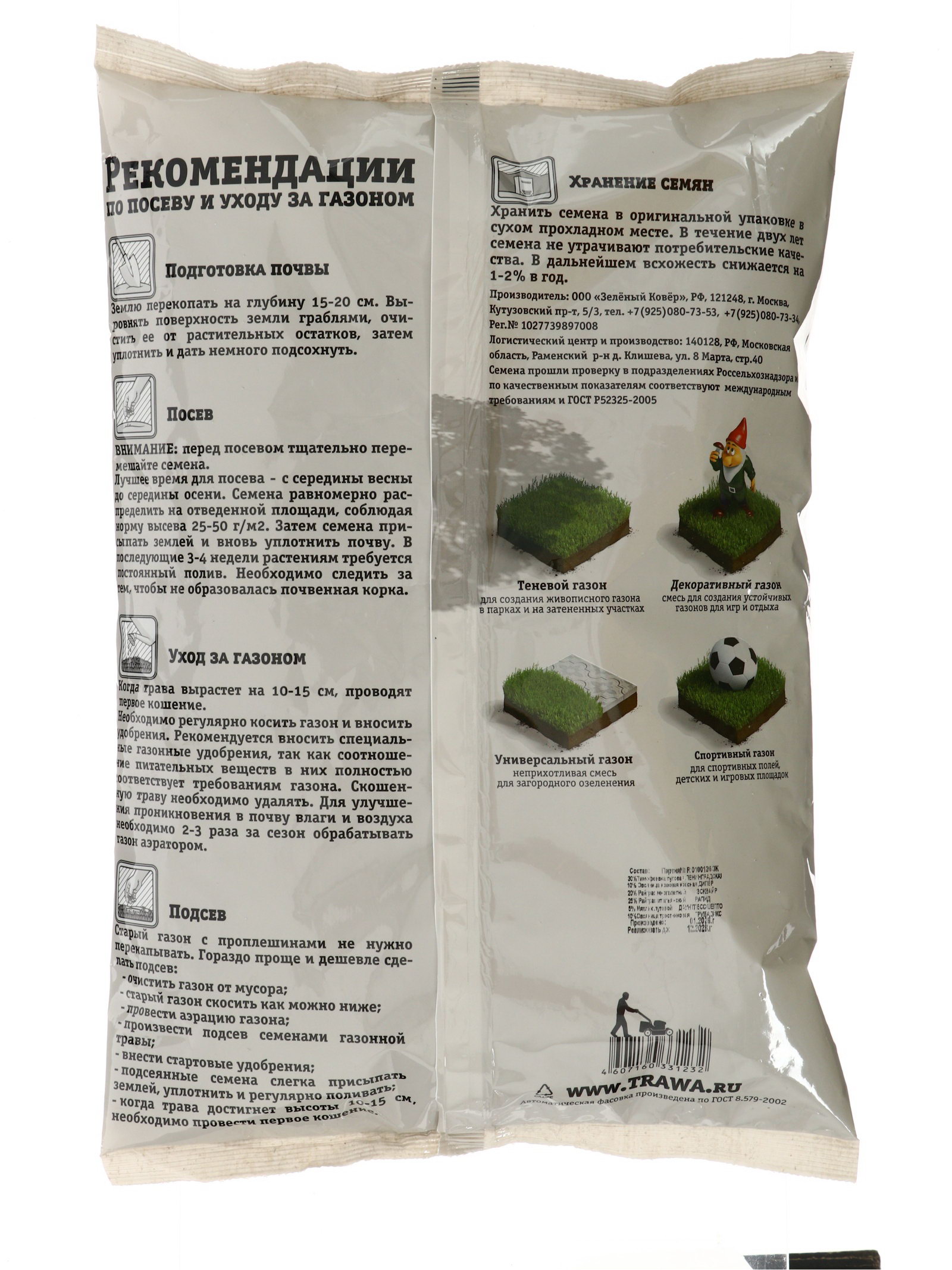 Посев (посадка) в грунт: Август, Июль, Июнь, Май, Сентябрь Состав газонных трав: Овсяница красная, Тимофеевка луговая Особенности газона: Быстрорастущий, Засухоустойчивый, Многолетний Размер упаковки: 20 x 7 x 24 см. tnved: 1209999900 Температурное ограничение: Нет Место выращивания: Открытый грунт Площадь, ?2: 40 Вес/Объём: 1 кг Солнечная газонная смесь «Зеленый квадрат» - это отличный выбор для создания красивого, устойчивого газона на открытых, хорошо освещенных площадках. Состав из тимофеевки луговой и овсяницы красной формирует плотный, ярко-зеленый травяной ковер, который отличается засухоустойчивостью, быстрым ростом и долголетием. Упаковки 1 кг достаточно для засева 40 м².